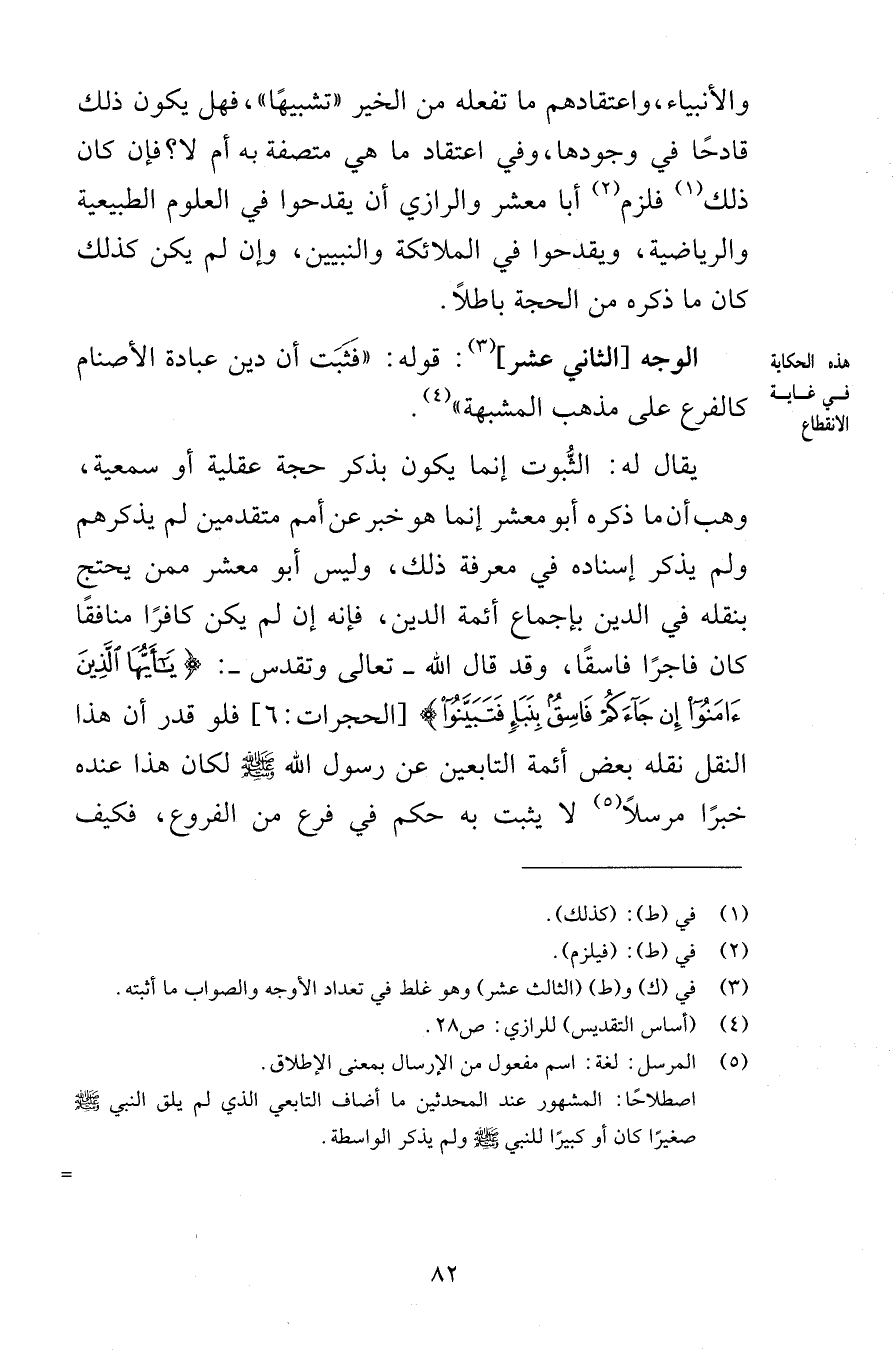 والأنبياء واعتقادهم ما تفعله من الخير تشبيهًا فهل يكون ذلك قادحًا في وجودها وفي اعتقاد ما هي متصفة به أم لا فإن كان ذلك فلزم أبا معشر والرازي أن يقدحوا في العلوم الطبيعية والرياضية ويقدحوا في الملائكة والنبيين وفن لم يكن كذلك ما ذكره من الحجة باطلاً الوجه الثاني عشر قوله فَثَبَت أن دين عبادة الأصنام كالفرع على مذهب المشبهة يقال له الثُّبوت إنما يكون بذكر حجة عقلية أو سمعية وهب أن ما ذكره أبو معشر إنما هو خبر عن أمم متقدمين لم يذكرهم ولم يذكر إسناده في معرفة ذلك وليس أبو معشر ممن يحتج بنقله في الدين بإجماع أئمة الدين فإنه لم يكن كافرًا منافقًا كان فاجرًا فاسقًا وقد قال الله تعالى وتقدس يَا أَيُّهَا الَّذِينَ آمَنُوا إِن جَاءكُمْ فَاسِقٌ بِنَبَأٍ فَتَبَيَّنُوا [الحجرات 6] فلو قدر أن هذا النقل نقله بعض أئمة التابعين عن رسول الله صلى الله عليه وسلم لكان هذا عنده خبرًا مرسلاً لا يثبت به حكم في فرع من الفروع فكيف