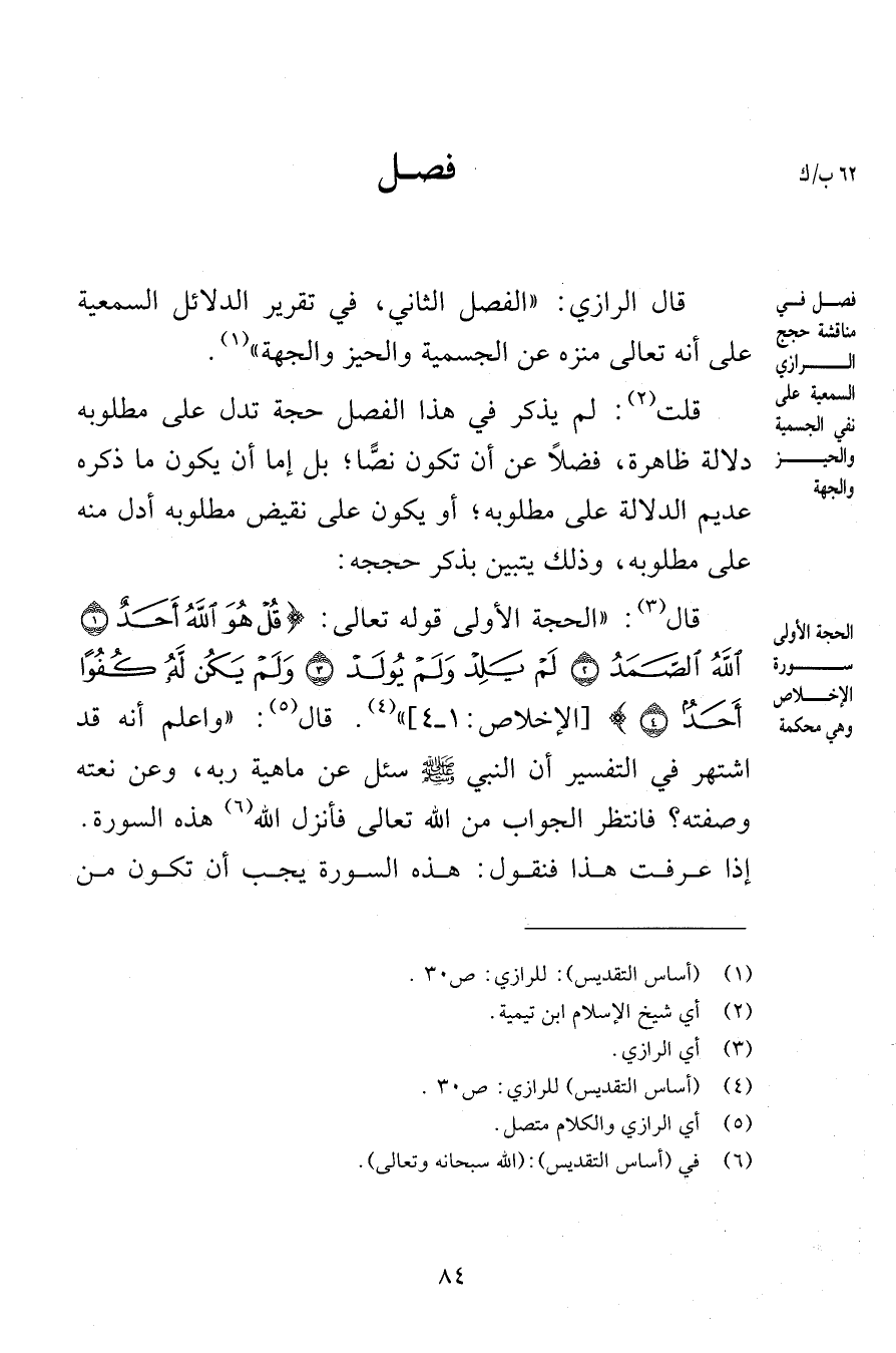 فصل قال الرازي الفصل الثاني في تقرير الدلائل السمعية على أنه تعالى منزه عن الجسمية والحيز والجهة قلت لم يذكر في هذا الفصل حجة تدل على مطلوبه دلالة ظاهرة فضلاً عن أن تكون نصًّا بل إما أن يكون ما ذكره عديم الدلالة على مطلوبه وذلك يتبين بذكر حججه قال الحجة الأولى قوله تعالى قُلْ هُوَ اللَّهُ أَحَدٌ {1} اللَّهُ الصَّمَدُ {2} لَمْ يَلِدْ وَلَمْ يُولَدْ {3} وَلَمْ يَكُن لَّهُ كُفُواً أَحَدٌ {4} [الإخلاص 1-4] قال واعلم أنه قد اشتهر في التفسير أن النبي صلى الله عليه وسلم سئل عن ماهية ربه وعن نعته وصفته فانتظر الجواب من الله تعالى فأنزل الله هذه السورة إذا عرفت هذا فنقول هذه السورة يجب أن تكون من