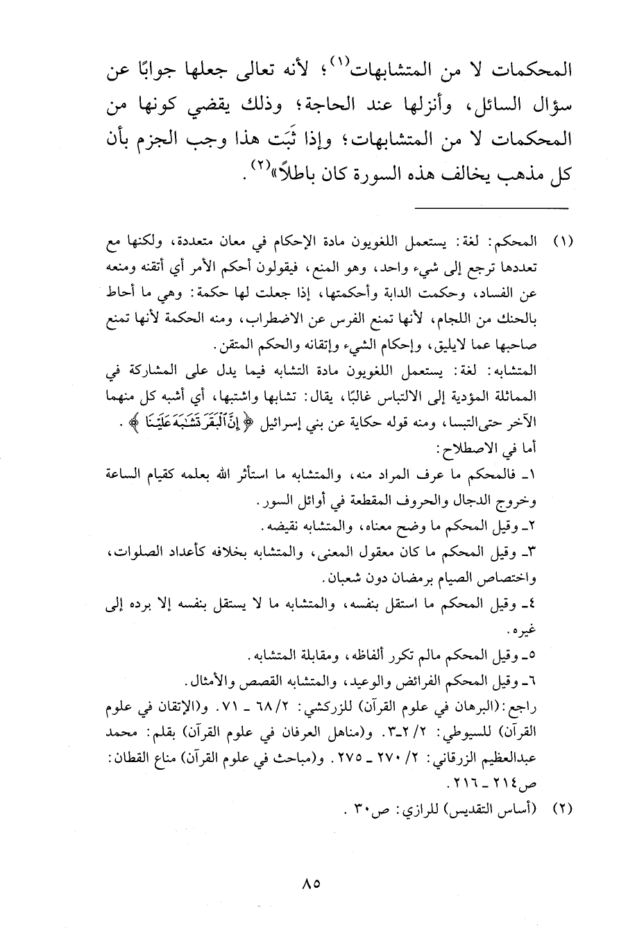 المحكمات لا من المتشابهات لأنه تعالى جعلها جوابًا عن سؤال السائل وأنزلها عند الحاجة وذلك يقضي كونها من المحكمات لا من المتشابهات وإذا ثَبَت هذا وجب الجزم بأن كل مذهب يخالف هذه السورة كان باطلاً