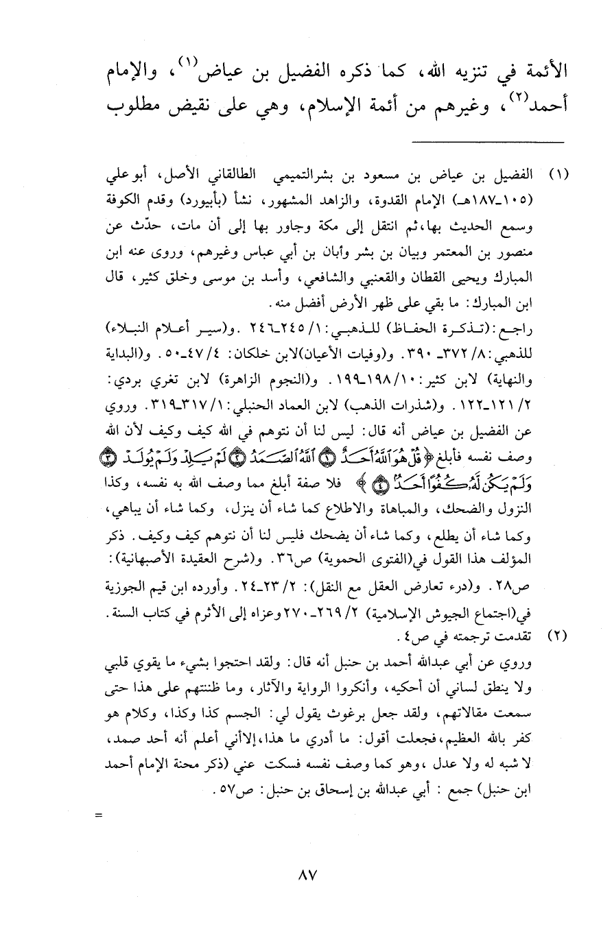 الأئمة في تنزيه الله كما ذكره الفضيل بن عياض والإمام أحمد وغيرهم من أئمة الإسلام وهي على نقيض مطلوب