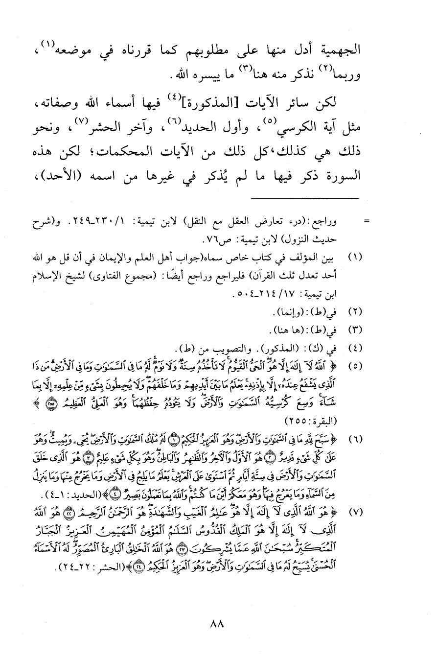 الجهمية أدل منها على مطلوبهم كما قررناه في موضعه وربما نذكر منه هنا ما ييسره الله لكن سائر الآيات المذكورة فيها أسماء الله وصفاته مثل آية الكرسي وأول الحديد وآخر الحشر ونحو ذلك هي كذلك كل ذلك من الآيات المحكمات لكن هذه السورة ذكر فيها ما لم يُذكر في غيرها من اسمه الأحد