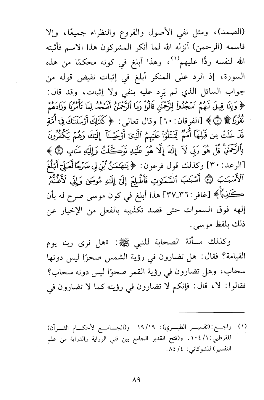 الصمد ومثل نفي الأصول والفروع والنظراء جميعًا وإلا فاسمه الرحمن أنزله الله لما أنكر المشركون هذا الاسم فأثبته الله لنفسه ردًّا عليهم وهذا أبلغ في كونه محكمًا من هذه السورة إذ الرد على المنكر أبلغ في إثبات نقيض قوله من جواب السائل الذي لم يَرِد عليه نفي ولا إثبات وقد قال وَإِذَا قِيلَ لَهُمُ اسْجُدُوا لِلرَّحْمَنِ قَالُوا وَمَا الرَّحْمَنُ أَنَسْجُدُ لِمَا تَأْمُرُنَا وَزَادَهُمْ نُفُوراً {60} [الفرقان 60] وقال تعالى كَذَلِكَ أَرْسَلْنَاكَ فِي أُمَّةٍ قَدْ خَلَتْ مِن قَبْلِهَا أُمَمٌ لِّتَتْلُوَ عَلَيْهِمُ الَّذِيَ أَوْحَيْنَا إِلَيْكَ وَهُمْ يَكْفُرُونَ بِالرَّحْمَنِ قُلْ هُوَ رَبِّي لا إِلَهَ إِلاَّ هُوَ عَلَيْهِ تَوَكَّلْتُ وَإِلَيْهِ مَتَابِ {30} [الرعد 30] وكذلك قول فرعون يَا هَامَانُ ابْنِ لِي صَرْحاً لَّعَلِّي أَبْلُغُ الْأَسْبَابَ {36} أَسْبَابَ السَّمَاوَاتِ فَأَطَّلِعَ إِلَى إِلَهِ مُوسَى وَإِنِّي لَأَظُنُّهُ كَاذِباً [غافر 36-37] هذا أبلغ في كون موسى صرح له بأن إلهه فوق السموات حتى قصد تكذيبه بالفعل من الإخبار عن ذلك بلفظ موسى وكذلك مسألة الصحابة للنبي صلى الله عليه وسلم هل نرى ربنا يوم القيامة فقال هل تضارون من رؤية الشمس صحوًا ليس دونها سحاب وهل تضارون في رؤية القمر صحوًا ليس دونه سحاب فقالوا لا قال فإنكم لا تضارون في رؤيته كما لا تضارون في