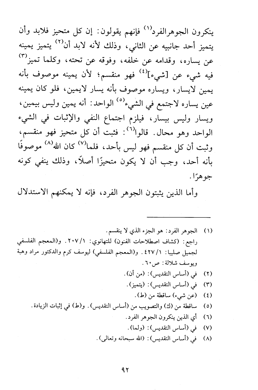 ينكرون الجوهرالفرد فإنهم يقولون إن كل متحيز فلابد وأن يتميز أحد جانبيه عن الثاني وذلك لأنه لابد أن يتميز يمينه عن يساره وقدامه عن خلفه وفوقه عن تحته وكلما تميز فيه شيء عن شيء فهو منقسم لأن يمينه موصوف بأنه يمين لايسار ويساره موصوف بأنه يسار لايمين فلو كان يمينه عين يساره لاجتمع في الشيء الواحد أنه يمين وليس بيمين ويسار وليس بيسار فيلزم اجتماع النفي والإثبات في الشيء الواحد وهو محال قالوا فثبت أن كل متحيز فهو منقسم وثبت أن كل منقسم فهو ليس بأحد فلما كان الله موصوفًا بأنه أحد وجب أن لا يكون متحيزًا أصلاً وذلك ينفي كونه جوهرًا وأما الذين يثبتون الجوهر الفرد فإنه لا يمكنهم الاستدلال