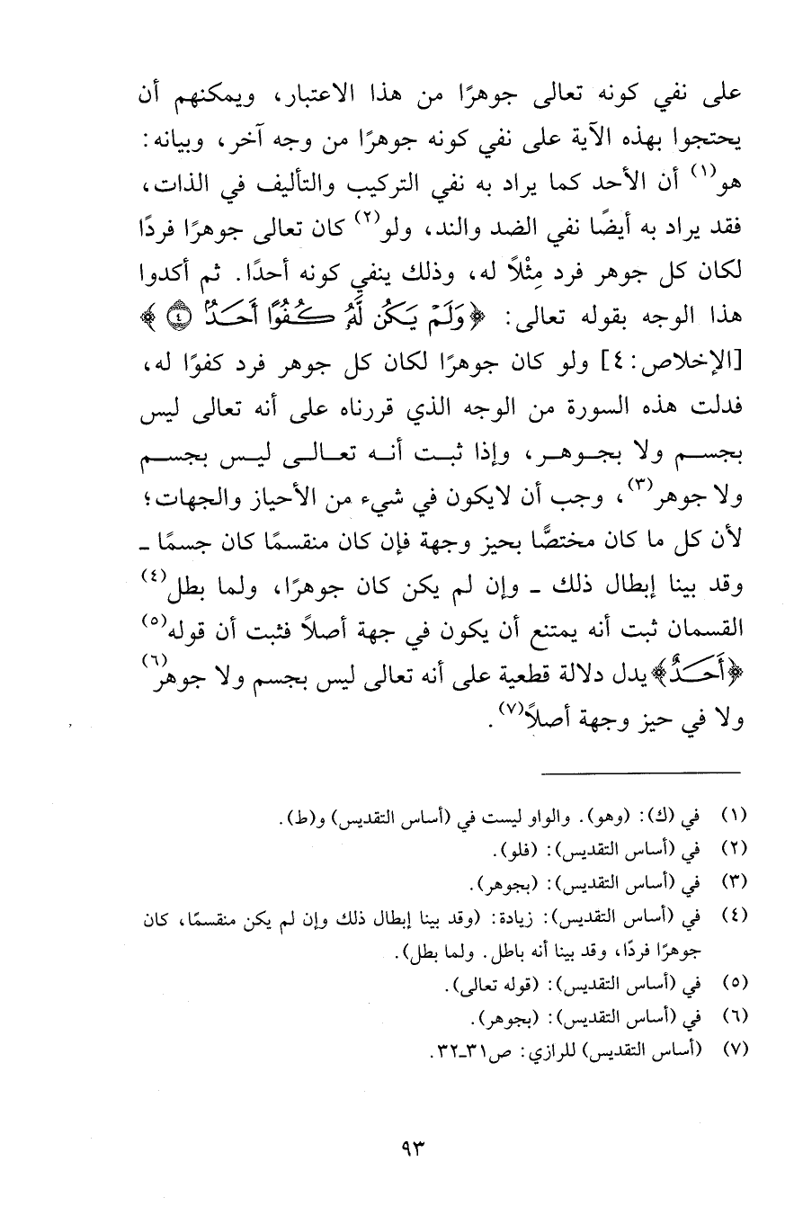 على نفي كونه تعالى جوهرًا من هذا الاعتبار ويمكنهم أن يحتجوا بهذه الآية على نفي كونه جوهرًا من وجه آخر وبيانه هو أن الأحد كما يراد به نفي التركيب والتأليف في الذات فقد يراد به أيضًا نفي الضد والند ولو كان الله تعالى جوهرًا فردًا لكان كل جوهر فرد مِثْلاً له وذلك ينفي كونه أحدًا ثم أكدوا هذا الوجه بقوله تعالى وَلَمْ يَكُن لَّهُ كُفُواً أَحَدٌ {4} [الإخلاص 4] ولو كان جوهرًا لكان كل جوهر فرد كفوًا له فدلت هذه السورة من الوجه الذي قررناه أنه تعالى ليس بجسم ولا بجوهر وإذا ثبت أنه تعالى ليس بجسم ولا جوهر وجب أن لايكون في شيء من الأحياز والجهات لأن كل ما كان مختصًّا بحيز وجهة فإن كان منقسمًا كان جسمًا وقد بينا إبطال ذلك وإن لم يكن كان جوهرًا ولما بطل القسمان ثبت أنه يمتنع أن يكون في جهة أصلاً فثبت أن قوله أَحَدٌ يدل دلالة قطعية على أنه تعالى ليس بجسم ولا جوهر ولا في حيز وجهة أصلاً