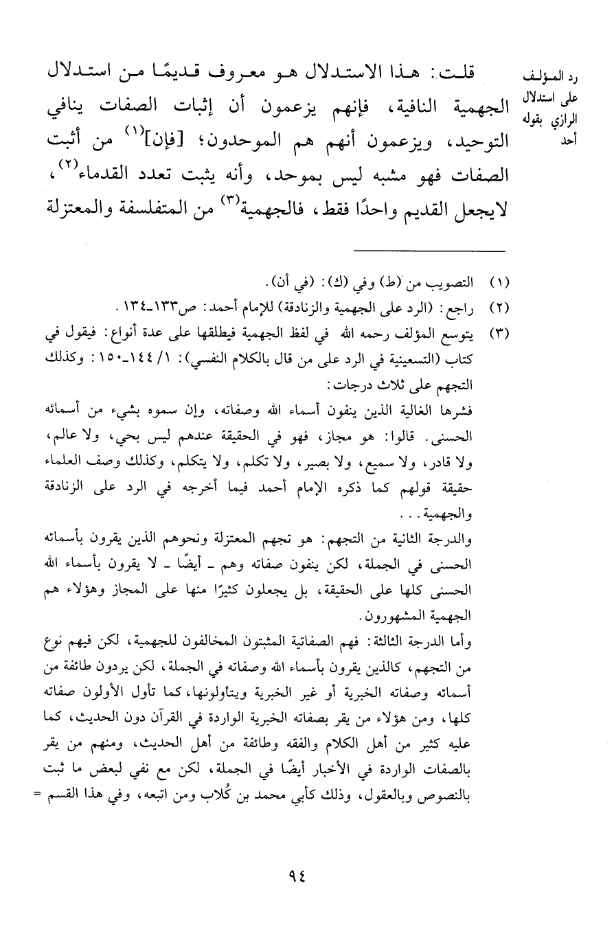 قلت هذا الاستدلال هو معروف قديمًا من استدلال الجهمية النافية فإنهم يزعمون أن إثبات الصفات ينافي التوحيد ويزعمون أنهم هم الموحدون فإن من أثبت الصفات فهو مشبه ليس بموحد وأنه يثبت تعدد القدماء لايجعل القديم واحدًا فقط فالجهمية من المتفلسفة والمعتزلة