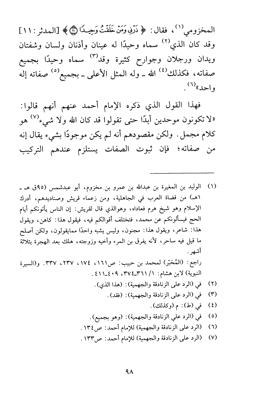 المخزومي فقال ذَرْنِي وَمَنْ خَلَقْتُ وَحِيداً {11} [المدثر 11] وقد كان الذي سماه وحيدًا له عينان وأذنان ولسان وشفتان ويدان ورجلان وجوارح كثيرة وقد سماه وحيدًا بجميع صفاته فكذلك الله وله المثل الأعلى بجميع صفاته إله واحد فهذا القول الذي ذكره الإمام أحمد عنهم أنهم قالوا لا تكونون موحدين أبدًا حتى تقولوا قد كان الله ولا شيء هو كلام مجمل ولكن مقصودهم أنه لم يكن موجودًا بشيء يقال إنه من صفاته فإن ثبوت الصفات يستلزم عندهم التركيب