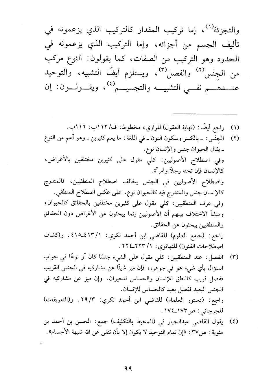 والتجزئة إما تركيب المقدار كالتركيب الذي يزعمونه في تأليف الجسم من أجزائه وإما التركيب الذي يزعمونه في الحدود وهو التركيب من الصفات كما يقولون النوع مركب من الجِنْس والفصل ويستلزم أيضًا التشبيه والتوحيد عندهم نفي التشبيه والتجسيم ويقولون إن