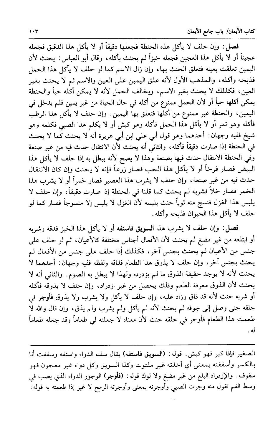 فصل: وإن حلف لا يشرب هذا السويق فاستفه أولا يأكل هذا الخبز فدقه وشربه أو ابتلعه من غير مضغ لم يحنث لأن الأفعال أجناس مختلفة كالأعيان ثم لو حلف على جنس من الأعيان لم يحنث بجنس آخر فكذلك إذا حلف على جنس من الأفعال لم يحنث بجنس آخر وإن حلف لا يذوق هذا الطعام فذاقه ولفظه ففيه وجهان: أحدهما: لا يحنث لأنه لا يوجد حقيقة الذوق ما لم يزدرده ولهذا لا يبطل به الصوم والثاني: أنه لا يحنث الذوق معرفة الطعم وذلك يحصل من غير ازدراد وإن حلف لا يذوقه فأكله أو شربه حنث لأنه قد ذاق وزاد عليه وإن حلف لا يأكل ولا يشرب ولا يذوق فأوجر في حلقه حتى وصل إلى جوفه لم يحنث لأنه لم يأكل ولم يشرب ولم يذق وإن قال والله لا طعمت هذا الطعام فأوجر في حلقه حنث لأن معناه لا جعلته لي طعاماً وقد جعله طعاما له.