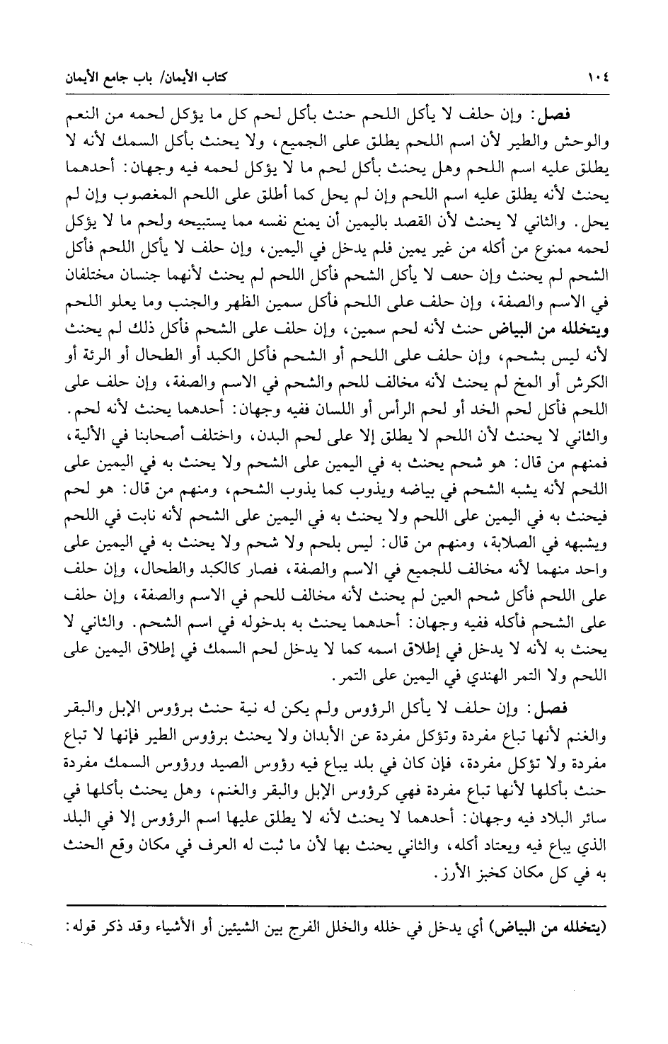 فصل: وإن حلف لا يأكل الرؤوس ولم يكن له نية حنث برؤوس الإبل والبقر والغنم لأنها تباع مفردة وتؤكل مفردة عن الأبدان ولا يحنث برؤوس الطير فإنها لا تباع مفردة ولا تؤكل مفردة فإن كان في بلد يباع فيه رؤوس الصيد ورؤوس السمك مفردة حنث بأكلها لأنها تباع مفردة فهي كرؤوس الإبل والبقر والغنم وهل يحنث بأكلها في سائر البلاد فيه وجهان: أحدهما: لا يحنث لأنه لا يطلق عليها اسم الرؤوس إلا في البلد الذي يباع فيه ويعتاد أكله والثاني: يحنث بها لأن ما ثبت له العرف في مكان وقع الحنث به في كل مكان كخبز الأرز.