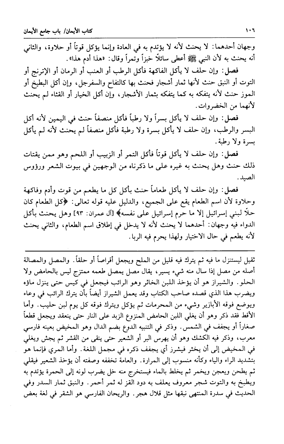 فصل: وإن حلف لا يأكل الفاكهة فأكل الرطب أو العنب أو الرمان أو الإترنج أو التوت أو النبق حنث لأنها ثمار أشجار فحنث بها كالتفاح والسفرجل وإن أكل البطيخ أو الموز حنث لأنه يتفكه به كما يتفكه بثمار الأشجار وإن أكل الخيار أو القثاء لم يحنث لأنهما من الخضروات.