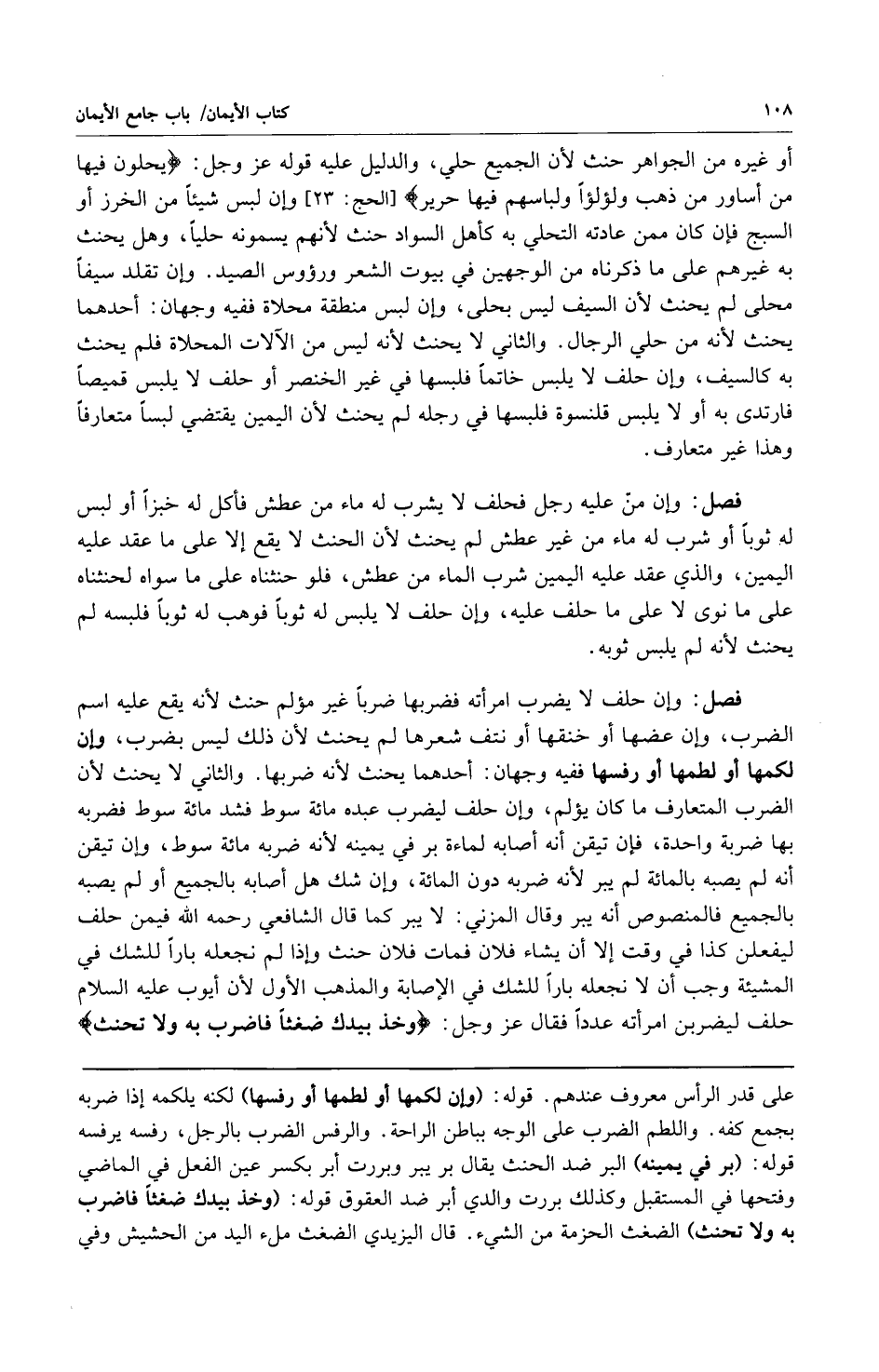 أو غيره من الجواهر لأن الجميع حلي والدليل عليه قوله عز وجل: {يُحَلَّوْنَ فِيهَا مِنْ أَسَاوِرَ مِنْ ذَهَبٍ وَلُؤْلُؤاً وَلِبَاسُهُمْ فِيهَا حَرِيرٌ} [الحج: 23] وإن لبس شيئاً من الخرز أو السبج فإن كان ممن عادته التحلي بها كأهل السواد حنث لأنهم يسمونه حليا وهل يحنث به غيرهم على ما ذكرناه من الوجهين في بيوت الشعر ورؤوس الصيد وإن تقلد سيفاً محلى لم يحنث لأن السيف ليس بحلى وإن لبس منطقة محلاة ففيه وجهان: أحدهما: يحنث لأنه من حلي الرجال والثاني: لا يحنث لأنه ليس من الآلات المحلاة فلم يحنث به كالسيف وإن حلف لا يلبس خاتماً فلبسها في غير الخنصر أو حلف لا يلبس قميصاً فارتدى به أولا يلبس قلنسوة فلبسها في رجله لم يحنث لأن اليمين يقتضي لبسا متعارفا وهذا غير متعارف.