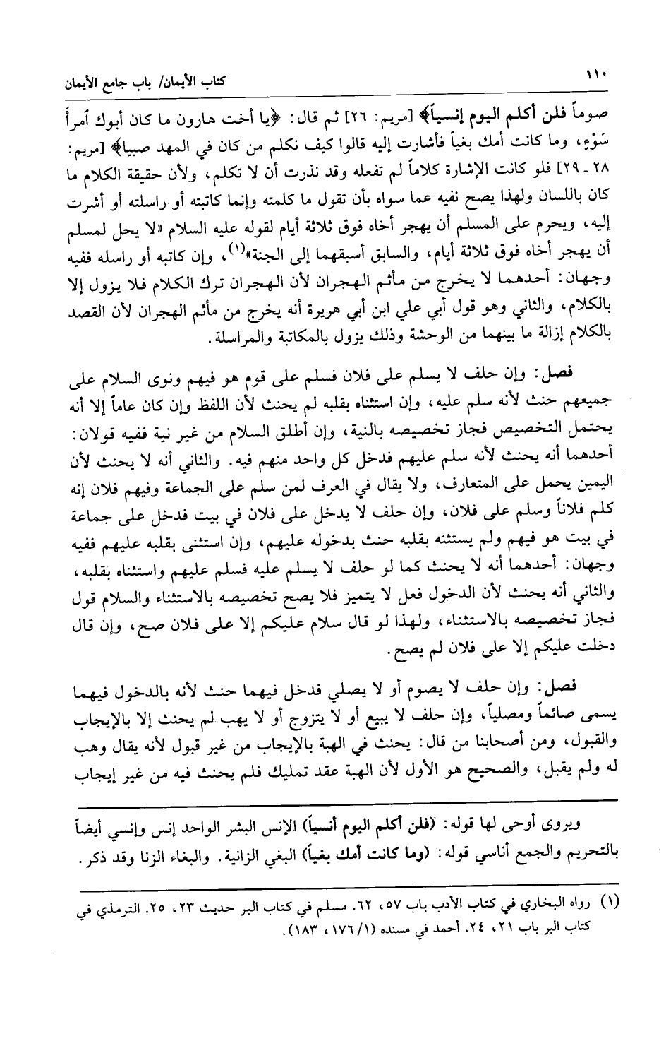 صَوْماً فَلَنْ أُكَلِّمَ الْيَوْمَ إِنْسِيّاً} [مريم: 26] ثم قال: {يَا أُخْتَ هَارُونَ مَا كَانَ أَبُوكِ امْرَأَ سَوْءٍ وَمَا كَانَتْ أُمُّكِ بَغِيّاً فَأَشَارَتْ إِلَيْهِ قَالُوا كَيْفَ نُكَلِّمُ مَنْ كَانَ فِي الْمَهْدِ صَبِيّاً} [مريم: 28 - 29] فلو كانت الإشارة كلاما لم تفعله وقد نذرت أن لا تكلم ولأن حقيقة الكلام ما كان باللسان ولهذا يصح نفيه عما سواه بأن تقول ما كلمته وإنما كاتبته أو راسلته أو أشرت إليه ويحرم على المسلم أن يهجر أخاه فوق ثلاثة أيام لقوله عليه السلام: "لا يحل لمسلم أن يهجر أخاه فوق ثلاثة أيام والسابق أسبقهما إلى الجنة" 1. وإن كاتبه أو راسله ففيه وجهان: أحدهما: لا يخرج من مأثم الهجران لأن الهجران ترك الكلام فلا يزول إلا بالكلام والثاني: وهو قول أبي علي ابن أبي هريرة أنه يخرج من مأثم الهجران لأن القصد بالكلام إزالة ما بينهما من الوحشة وذلك يزول بالمكاتبة والمراسلة.