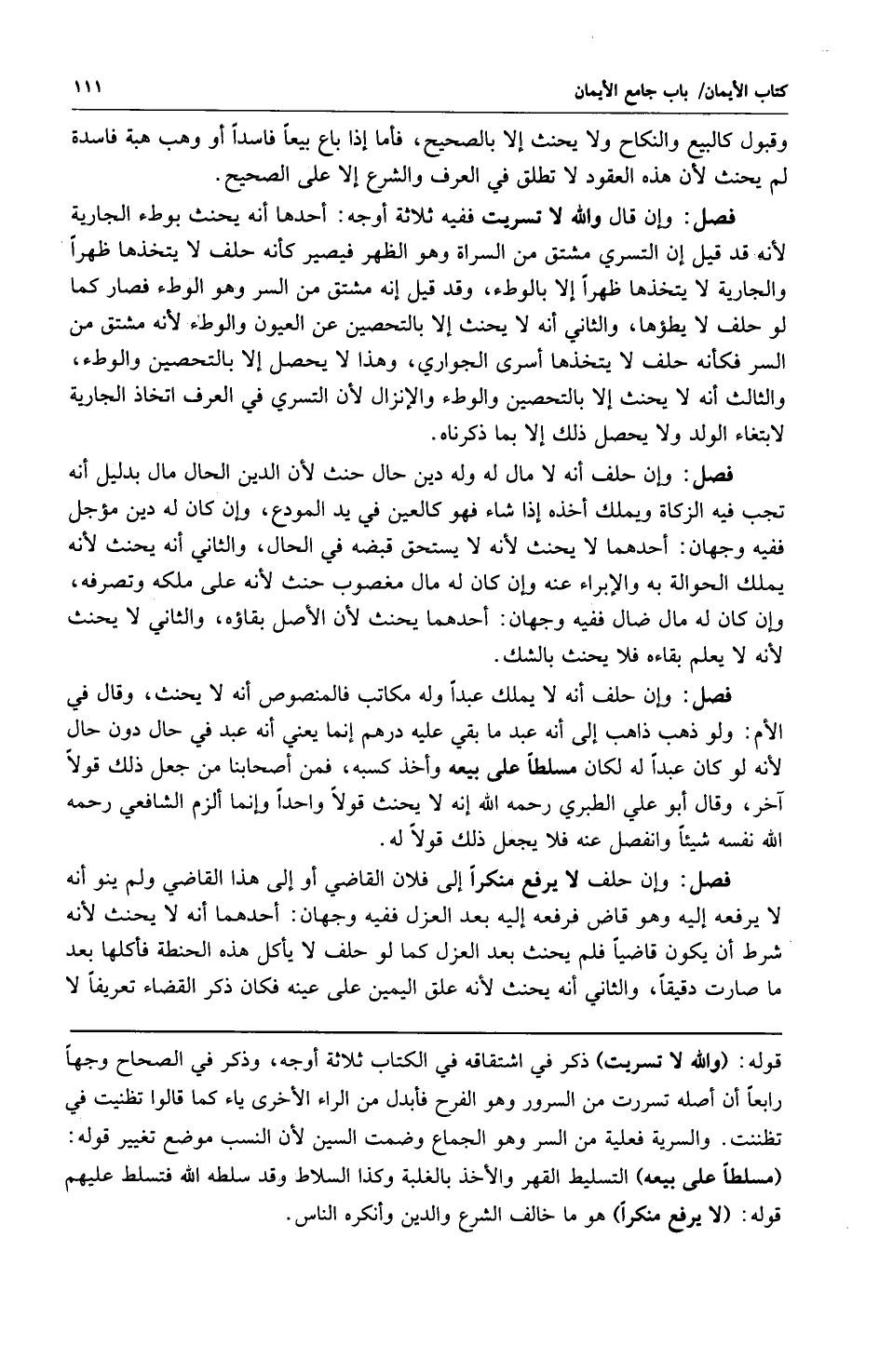 فصل: وإن قال والله لا تسريت ففيه ثلاثة أوجه: أحدها أن يحنث بوطء الجارية لأنه قد قيل إن التسري مشتق من السراة وهو الظهر فيصير كأنه حلف لا يتخذها ظهراً والجارية لا يتخذها ظهرا إلا بالوطء وقد قيل إنه مشتق من السر وهو الوطء فصار كما لو حلف لا يطؤها والثاني: أنه لا يحنث إلا بالتحصين عن العيون والوطء لأنه مشتق من السر فكأنه حلف لا يتخذها أسرى الجواري وهذا لا يحصل إلا بالتحصين والوطء والثالث أنه لا يحنث إلا بالتحصين والوطء والإنزال لأن التسري في العرف اتخاذ الجارية لابتغاء الولد ولا يحصل ذلك إلا بما ذكرناه.