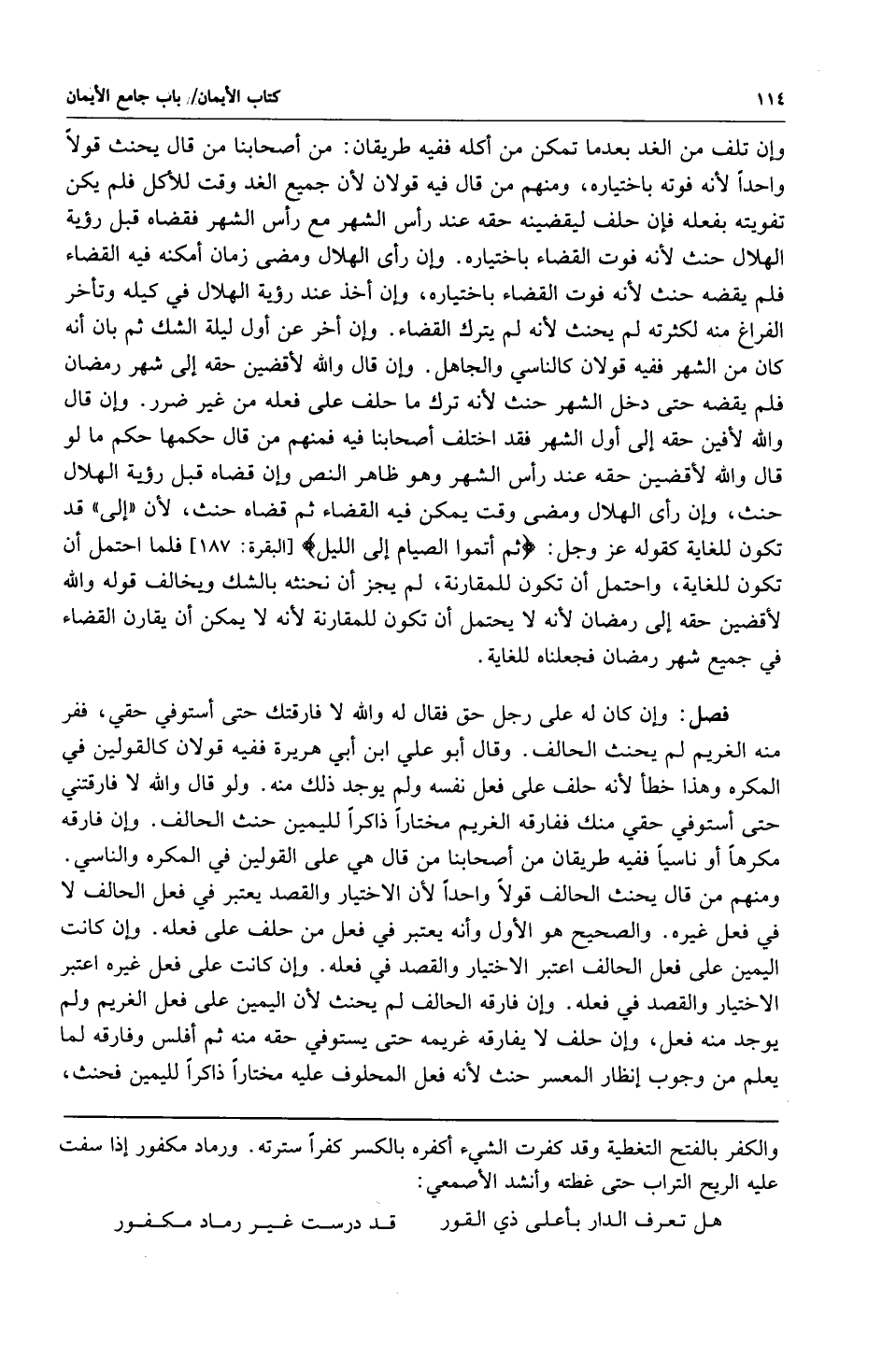 وإن تلف من الغد بعدما تمكن من أكله ففيه طريقان: من أصحابنا من قال يحنث قولا واحدا لأنه فوته باختياره ومنهم من قال فيه قولان لأن جميع الغد وقت للأكل فلم يكن تفويته بفعله فإن حلف ليقضينه حقه عند رأس الشهر مع رأس الشهر فقضاه قبل رؤية الهلال حنث لأنه فوت القضاء باختياره وإن رأى الهلال ومضى زمان أمكنه فيه القضاء فلم يقضه حنث لأنه فوت القضاء باختياره وإن أخذ عند رؤية الهلال في كيله وتأخر الفراغ منه لكثرته لم يحنث لأنه لم يترك القضاء وإن أخر عن أول ليلة الشك ثم بان أنه كان من الشهر ففيه قولان كالناسي والجاهل وإن قال والله لأقضين حقه إلى شهر رمضان فلم يقضه حتى دخل الشهر حنث لأنه ترك ما حلف على فعله من غير ضرر وإن قال والله لأفين حقه إلى أول الشهر فقد اختلف أصحابنا فيه فمنهم قال حكمها حكم ما لو قال والله لأقضين حقه عند رأس الشهر وهو ظاهر النص وإن قضاه قبل رؤية الهلال حنث وإن رأى الهلال ومضى وقت يمكن فيه القضاء ثم قضاه حنث لأن إلى فد تكون للغاية كقوله عز وجل: {ثُمَّ أَتِمُّوا الصِّيَامَ إِلَى اللَّيْلِ} [البقرة: 187] فلما احتمل أن تكون للغاية واحتمل أن تكون للمقارنة لم يجز أن نحنثه بالشك ويخالف قوله والله لأقضين حقه إلى رمضان لأنه لا يحتمل أن تكون للمقارنة لأنه لا يمكن أن يقارن القضاء في جميع شهر رمضان فجعلناه للغاية.