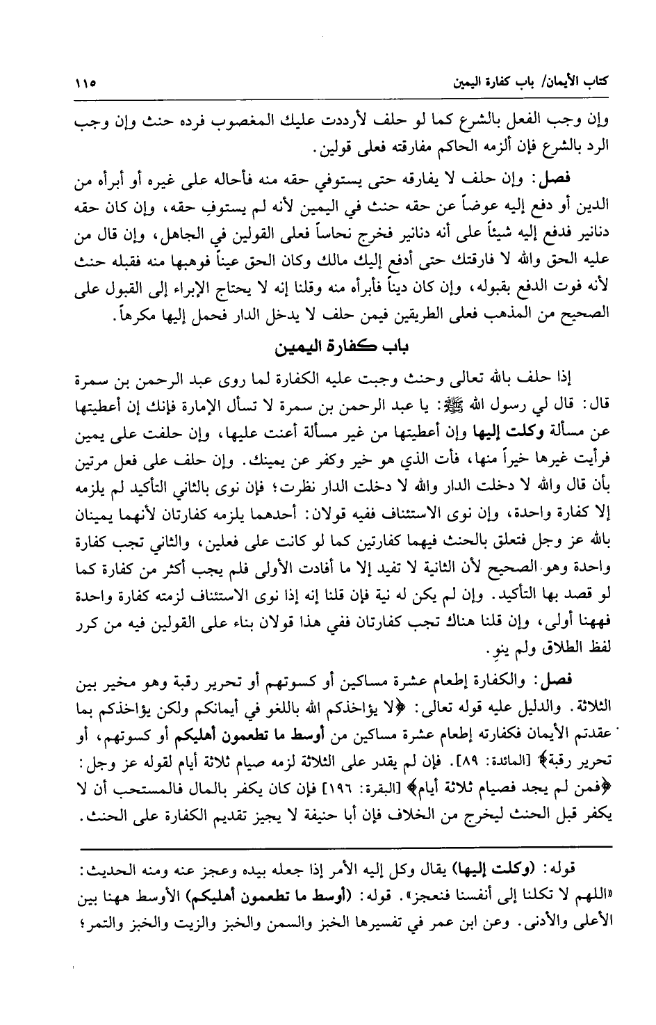 إذا حلف بالله تعالى ثم حنث وجبت عليه الكفارة لما روى عبد الرحمن بن سمرة قال: قال لي رسول الله صلى الله عليه وسلم: "يا عبد الرحمن بن سمرة لا تسأل الإمارة فإنك من أعطيتها عن مسألة وكلت إليها وإن أعطيتها من غير مسألة أعنت عليها وإن حلفت على يمين فرأيت غيرها خيراً منها فأت الذي هو خير وكفر عن يمينك". وإن حلف على فعل مرتين بأن قال والله لا دخلت الدار والله لا دخلت الدار نظرت فإن نوى بالثاني التأكيد لم يلزمه إلا كفارة واحدة وإن نوى الاستئناف ففيه قولان: أحدهما: يلزمه كفارتان لأنهما يمينان بالله عز وجل فتعلق بالحنث فيهما كفارتين كما لو كانت على فعلين والثاني: تجب كفارة واحدة وهو الصحيح لأن الثانية لا تفيد إلا ما أفادت الأولى فلم يجب أكثر من كفارة كما لو قصد بها التأكيد وإن لم يكن له نية فإن قلنا إنه إذا نوى الاستئناف لزمه كفارة واحدة فههنا أولى وإن قلنا هناك تجب كفارتان ففي هذا قولان بناء على القولين فيه من كرر لفظ الطلاق ولم ينو.