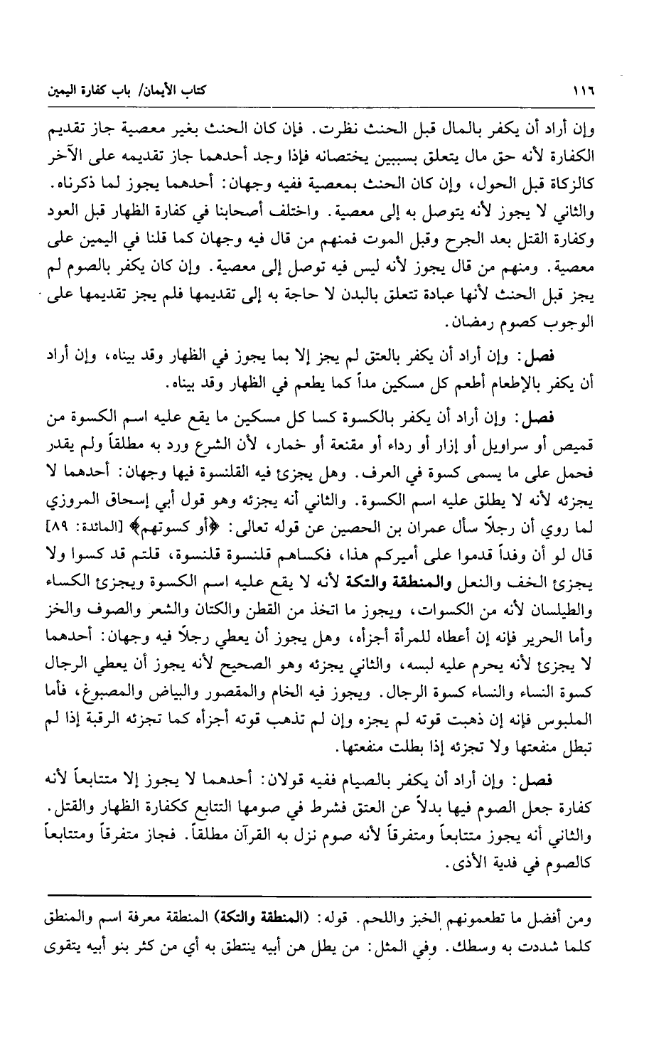 وإن أراد أن يكفر بالمال قبل الحنث نظرت فإن كان الحنث بغير معصية جاز تقديم الكفارة لأنه حق مال يتعلق بسببين يختصانه فإذا وجد أحدهما: جاز تقديمه على الآخر كالزكاة قبل الحول وإن كان الحنث بمعصية والثاني: يجوز لما ذكرناه والثاني: لا يجوز لأنه يتوصل به إلى معصية واختلف أصحابنا في كفارة الظهار قبل العود وكفارة القتل بعد الجرح وقبل الموت فمنهم من قال فيه وجهان كما قلنا في اليمين على معصية ومنهم من قال يجوز لأنه ليس فيه توصل إلى معصية وإن كان يكفر بالصوم لم يجز قبل الحنث لأنها عبادة تتعلق بالبدن لا حاجة به إلى تقديمها فلم يجز تقديمها على الوجوب كصوم رمضان.