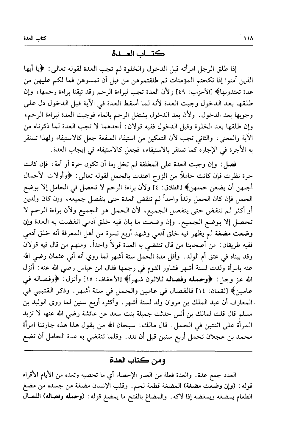 فصل: وإن وجبت العدة على المطلقة لم تخل إما أن تكون حرة أو أمة فإن كانت حرة نظرت فإن كانت حاملاً من الزوج اعتدت بالحمل لقوله تعالى: {وَأُولاتُ الْأَحْمَالِ أَجَلُهُنَّ أَنْ يَضَعْنَ حَمْلَهُنَّ} [الطلاق: 4] ولأن براءة الرحم لا تحصل في الحامل إلا بوضع الحمل فإن كان الحمل ولداً واحداً لم تنقض العدة حتى ينفصل جميعه وإن كان ولدين أو أكثر لم تنقض حتى ينفصل الجميع لأن الحمل هو الجميع ولأن براءة الرحم لا تحصل إلا بوضع الجميع وإن وضعت ما بان فيه خلق آدمي انقضت به العدة وإن وضعت مضغة لم يظهر فيه خلق آدمي وشهد أربع نسوة من أهل المعرفة أنه خلق آدمي ففيه طريقان: من أصحابنا من قال تنقضي به العدة قولاً واحداً ومنهم من قال فيه قولان وقد بيناه في عتق أم الولد وأقل مدة الحمل ستة أشهر لما روي أنه أتي عثمان رضي الله عنه بامرأة ولدت لستة أشهر فشاور القوم في رجمها فقال ابن عباس رضي الله عنه: أنزل الله عز وجل: {وَحَمْلُهُ وَفِصَالُهُ ثَلاثُونَ شَهْراً} [الأحقاف: 15] وأنزل: {وَفِصَالُهُ فِي عَامَيْنِ} [لقمان: 14] فالفصال في العامين والحمل في ستة أشهر وذكر القتيبي في المعارف أن عبد الملك بن مروان ولد لستة أشهر وأكثره أربع سنين لما روى الوليد بن مسلم قال قلت لمالك بن أنس حدثت جميلة بنت سعد عن عائشة رضي الله عنها لا تزيد المرأة على اثنتين في الحمل قال مالك: سبحان الله من يقول هذا هذه جارتنا امرأة محمد بن عجلان تحمل أربع سنين قبل أن تلد وقلما تنقضي به عدة الحامل أن تضع