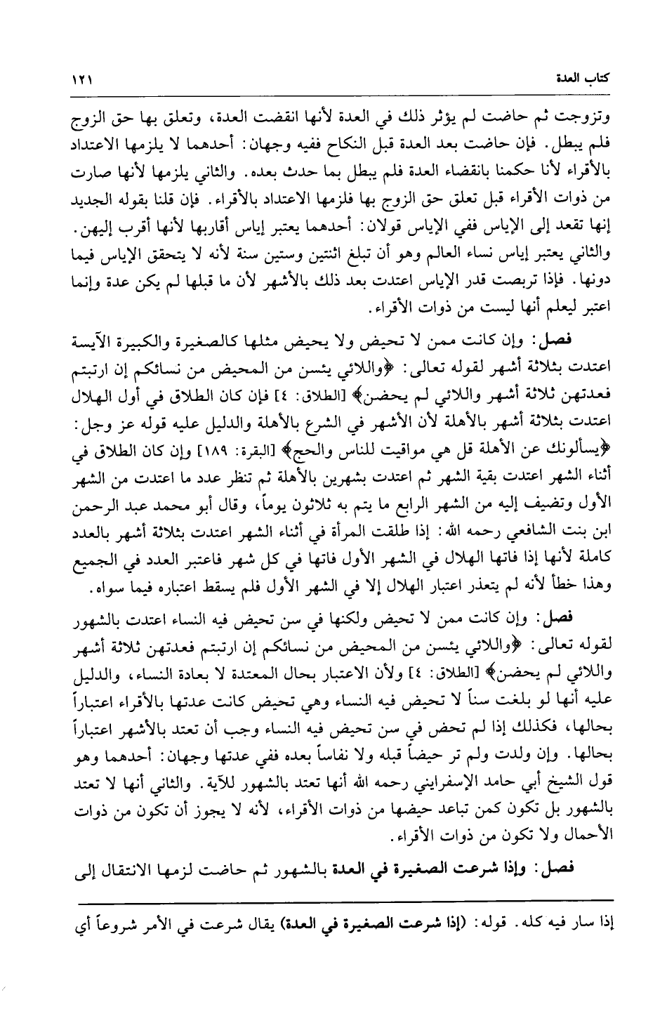 فصل: وإن كانت ممن لا تحيض ولكنها في سن تحيض فيه النساء اعتدت بالشهور لقوله تعالى: {وَاللَّائِي يَئِسْنَ مِنَ الْمَحِيضِ مِنْ نِسَائِكُمْ إِنِ ارْتَبْتُمْ فَعِدَّتُهُنَّ ثَلاثَةُ أَشْهُرٍ وَاللَّائِي لَمْ يَحِضْنَ} [الطلاق: 4] ولأن الاعتبار بحال المعتدة لا بعادة النساء والدليل عليه أنها لو بلغت سناً لا تحيض فيه النساء وهي تحيض كانت عدتها بالأقراء اعتباراً بحالها فكذلك إذا لم تحض في سن تحيض فيه النساء وجب أن تعتد بالأشهر اعتباراً بحالها وإن ولدت ولم تر حيضا قبله ولا نفاسا بعده ففي عدتها وجهان: أحدهما: وهو قول الشيخ أبي حامد الإسفرايني رحمه الله أنها تعتد بالشهور للآية والثاني: أنها لا تعتد بالشهور بل تكون كمن تباعد حيضها من ذوات الأقراء لأنه لا يجوز أن تكون من ذوات الأحمال ولا تكون من ذوات الأقراء.