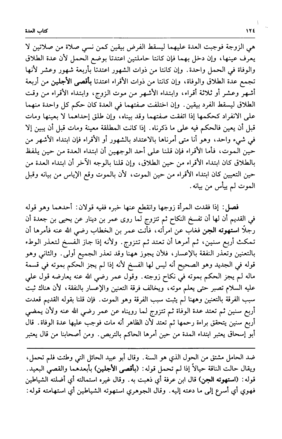 فصل: إذا فقدت المرأة زوجها وانقطع عنها خبره ففيه قولان: أحدهما: وهو قوله في القديم أن لها أن تفسخ النكاح ثم تتزوج لما روى عمر بن دينار عن يحيى بن جعدة أن رجلاً استهوته الجن فغاب عن امرأته فأتت عمر بن الخطاب رضي الله عنه فأمرها أن تمكث أربع سنين ثم أمرها أن تعتد ثم تتزوج ولأنه إذا جاز الفسخ لتعذر الوطء بالتعنين وتعذر النفقة بالإعسار فلأن يجوز ههنا وقد تعذر الجميع أولى والثاني: وهو قوله في الجديد وهو الصحيح أنه ليس لها الفسخ لأنه إذا لم يجز الحكم بموته في قسمة ماله لم يجز الحكم بموته في نكاح زوجته وقول عمر رضي الله عنه يعارضه قول علي عليه السلام تصبر حتى يعلم موته ويخالف فرقة التعنين والإعسار بالنفقة لأن هناك ثبت سبب الفرقة بالتعنين وههنا لم يثبت سبب الفرقة وهو الموت فإن قلنا بقوله القديم قعدت أربع سنين ثم تعتد عدة الوفاة ثم تتزوج لما رويناه عن عمر رضي الله عنه ولأن يمضي أربع سنين يتحقق براءة رحمها ثم تعتد لأن الظاهر أنه مات فوجب عليها عدة الوفاة قال أبو إسحاق يعتبر ابتداء المدة من حين أمرها الحاكم بالتربص ومن أصحابنا من قال يعتبر