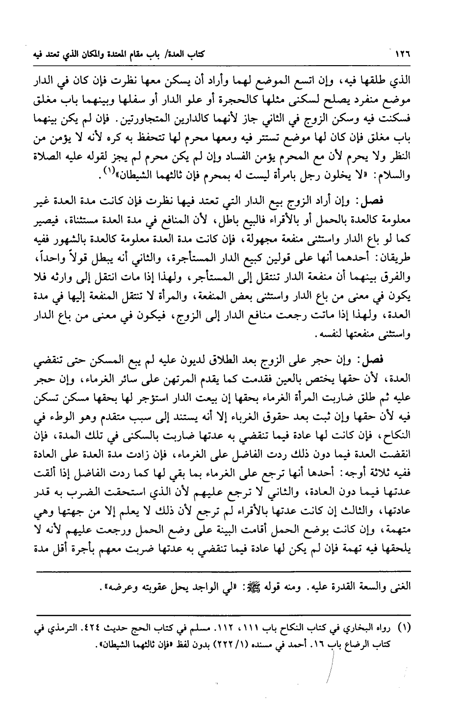 الذي طلقها فيه وإن اتسع الموضع لهما وأراد أن يسكن معها نظرت فإن كان في الدار موضع منفرد يصلح لسكنى مثلها كالحجرة أو علو الدار أو سفلها وبينهما باب مغلق فسكنت فيه وسكن الزوج في الثاني جاز لأنهما كالدارين المتجاورتين فإن لم يكن بينهما باب مغلق فإن كان لها موضع تستتر فيه ومعها محرم لها تتحفظ به كره لأنه لا يؤمن من النظر ولا يحرم لأن مع المحرم يؤمن بالفساد وإن لم يكن محرم لم يجز لقوله عليه الصلاة والسلام: " لا يخلون رجل بامرأة ليست له بمحرم فإن ثالثهما الشيطان" 1.