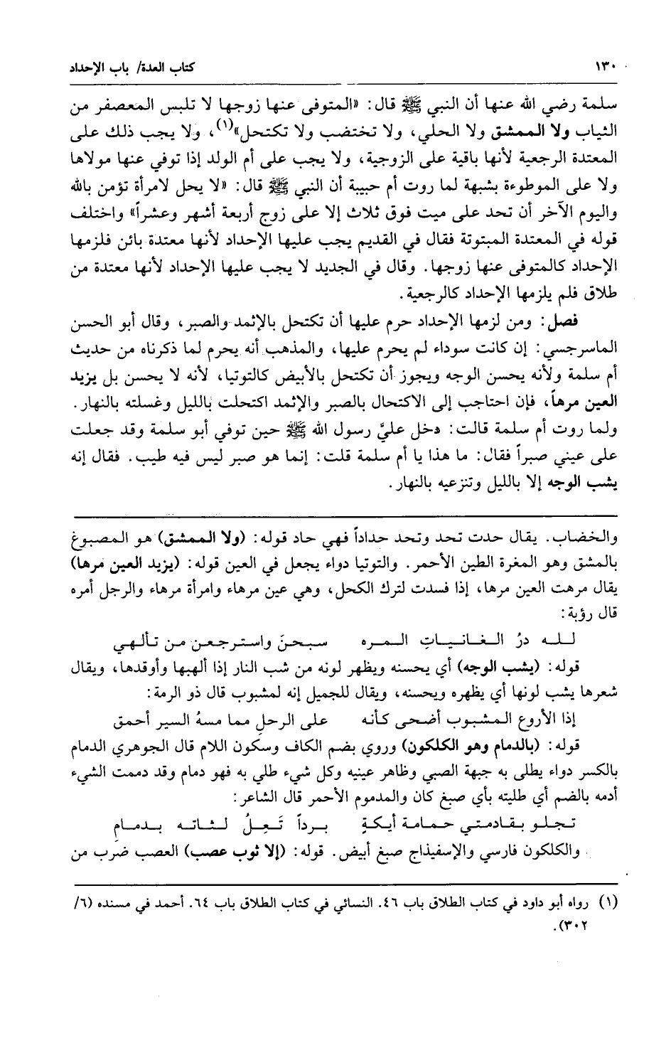 سلمة رضي الله عنها أن النبي صلى الله عليه وسلم قال: "المتوفى عنها زوجها لا تلبس المعصفر من الثياب ولا الممشق ولا الحلي ولا تختضب ولا تكتحل" 1. ولا يجب ذلك على المعتدة الرجعية لأنها باقية على الزوجية ولا يجب على أم الولد إذا توفي عنها مولاها ولا على الموطوءة بشبهة لما روت أم حبيبة أن النبي صلى الله عليه وسلم قال: "لا يحل لامرأة تؤمن بالله واليوم الآخر أن تحد على ميت فوق ثلاث إلا على زوج أربعة أشهر وعشرا". واختلف قوله في المعتدة المبتوتة فقال في القديم يجب عليها الإحداد لأنها معتدة بائن فلزمها الإحداد كالمتوفى عنها زوجها وقال في الجديد لا يجب عليها الإحداد لأنها معتدة من طلاق فلم يلزمها الإحداد كالرجعية.
