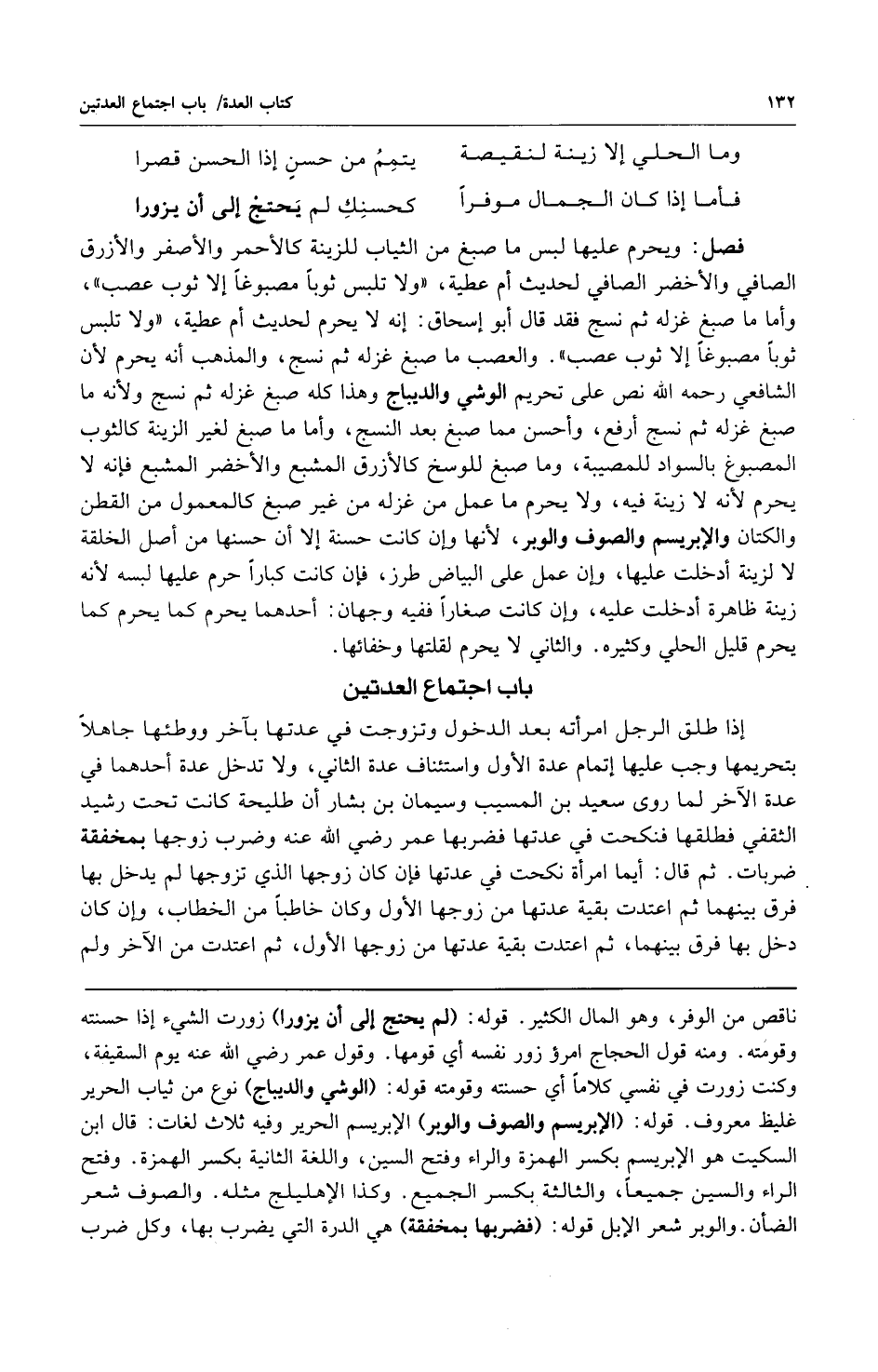 فصل: ويحرم عليها لبس ما صبغ من الثياب للزينة كالأحمر والأصفر والأزرق الصافي والأخضر الصافي لحديث أم عطية: ولا تلبس ثوبا مصبوغا إلا ثوب عصب وأما ما صبغ غزله ثم نسج فقد قال أبو إسحاق: إنه لا يحرم لحديث أم عطية: "ولا تلبس ثوبا مصبوغا إلا ثوب عصب"، والعصب ما صبغ غزله ثم نسج والمذهب أنه يحرم لأن الشافعي رحمه الله نص على تحريم الوشي والديباج وهذا كله صبغ غزله ثم نسج ولأنه ما صبغ غزله ثم نسج أرفع وأحسن مما صبغ بعد النسج وأما ما صبغ لغير الزينة كالثوب المصبوغ بالسواد للمصيبة وما صبغ للوسخ كالأزرق المشبع والأخضر المشبع فإنه لا يحرم لأنه لا زينة فيه ولا يحرم ما عمل من غزله من غير صبغ كالمعمول من القطن والكتان والإبريسم والصوف والوبر لأنها وإن كانت حسنة إلا أن حسنها من أصل الخلقة لا لزينة أدخلت عليها وإن عمل على البياض طرز فإن كانت كباراً حرم عليها لبسه لأنه زينة ظاهرة أدخلت عليه وإن كانت صغاراً ففيه وجهان: أحدهما: يحرم كما يحرم قليل الحلي وكثيره. والثاني: لا يحرم لقلتها وخفائها.