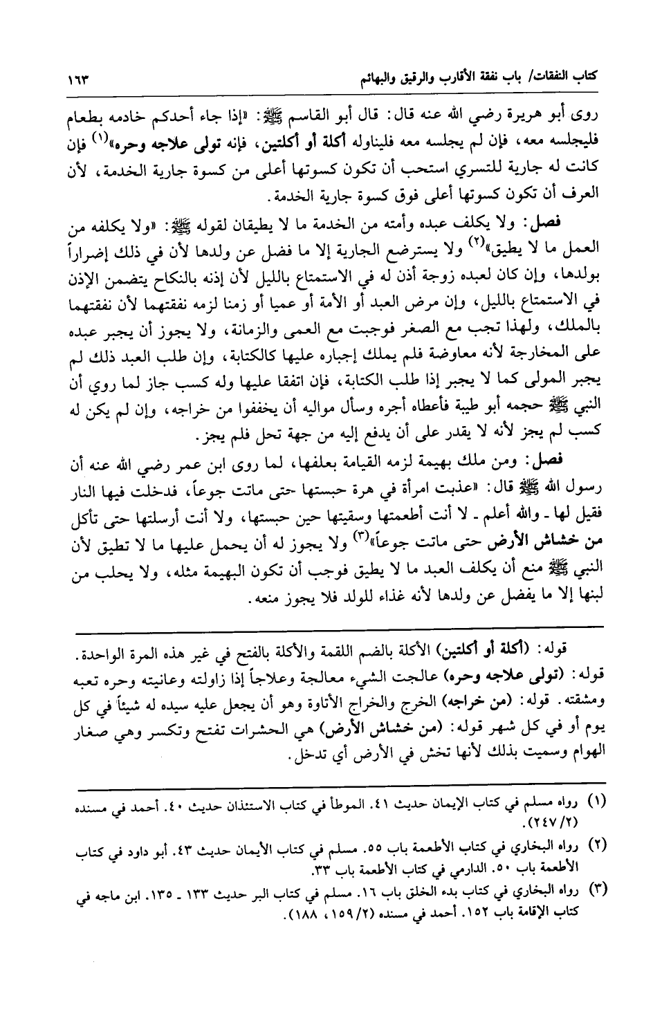 فصل: ومن ملك بهيمة لزمه القيامة بعلفها لما روى ابن عمر رضي الله عنه أن رسول الله صلى الله عليه وسلم قال: "عذبت امرأة في هرة حبستها حتى ماتت جوعاً فدخلت فيها النار فقيل لها ـ والله أعلم ـ لا أنت أطعمتها وسقيتها حين حبستها ولا أنت أرسلتها حتى تأكل من خشاش الأرض حتى ماتت جوعاً" 3. ولا يجوز له أن يحمل عليها ما لا تطيق لأن النبي صلى الله عليه وسلم منع أن يكلف العبد ما لا يطيق فوجب أن تكون البهيمة مثله ولا يحلب من لبنها إلا ما يفضل عن ولدها لأنه غذاء للولد فلا يجوز منعه.