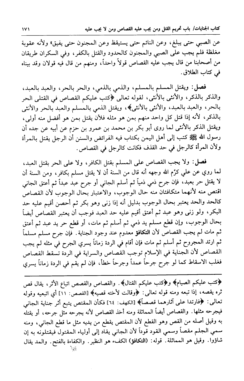 فصل: ولا يجب القصاص على المسلم بقتل الكافر ولا على الحر بقتل العبد لما روي عن علي كرم الله وجهه أنه قال من السنة أن لا يقتل مسلم بكافر ومن السنة أن لا يقتل حر بعبد فإن جرح ذمي ذمياً ثم أسلم الجاني أو جرح عبد عبداً ثم أعتق الجاني اقتص منه لأنهما متكافئان منه حال الوجوب والاعتبار بحال الوجوب لأن القصاص كالحد والحد يعتبر بحال الوجوب بدليل أنه إذا زنى وهو بكر ثم أحصن أقيم عليه حد البكر ولو زنى وهو عبد ثم أعتق عليه حد العبد فوجب أن يعتبر القصاص أيضاً بحال الوجوب وإن قطع مسلم يد ذمي ثم أسلم ثم مات أو قطع حر يد عبد ثم أعتق ثم مات لم يجب القصاص لأن التكافؤ معدوم عند وجود الجناية فإن جرح مسلم مسلماً ثم ارتد المجروح ثم أسلم ثم مات فإن أقام في الردة زمانا يسري
