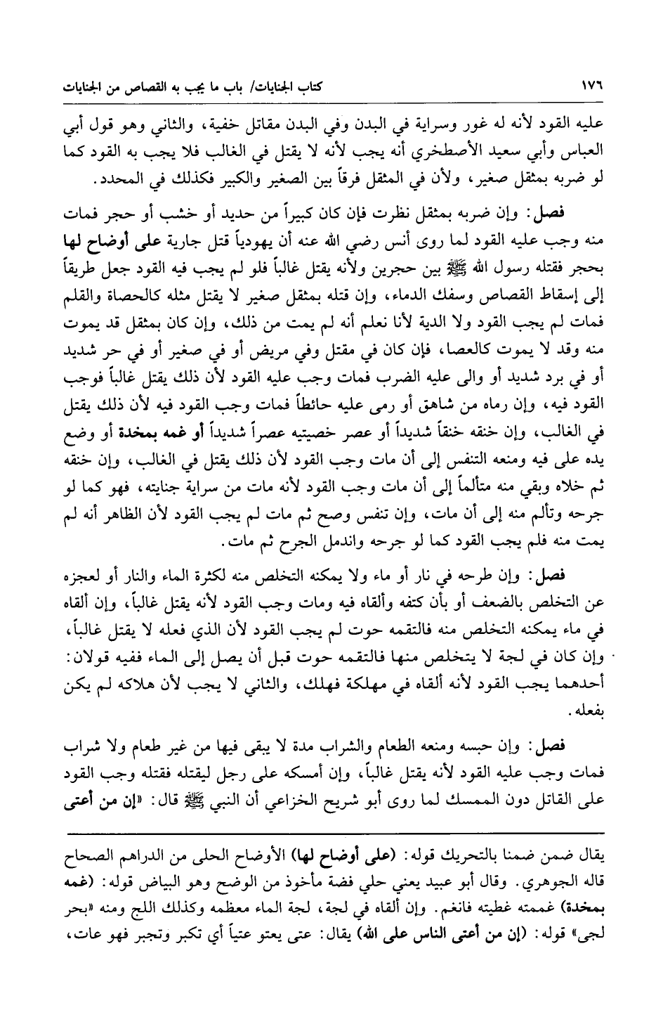 فصل: وإن ضربه بمثقل نظرت فإن كان كبيراً من حديد أو خشب أو حجر فمات منه وجب عليه القود لما روى أنس رضي الله عنه أن يهودياً قتل جارية على أوضاح لها بحجر فقتله رسول الله صلى الله عليه وسلم بين حجرين ولأنه يقتل غالبا فلولم يجب فيه القود جعل طريقاً إلى إسقاط القصاص وسفك الدماء وإن قتله بمثقل صغير لا يقتل مثله كالحصاة والقلم فمات لم يجب القود ولا الدية لأنا نعلم أنه لم يمت من ذلك وإن كان بمثقل قد يموت منه وقد لا يموت كالعصا فإن كان في مقتل وفي مريض أوفي صغير أوفي حر شديد أوفي برد شديد أو والى عليه الضرب فمات وجب القود لأن ذلك يقتل غالباً فوجب القود فيه وإن رماه من شاهق أو رمى عليه حائطاً فمات وجب القود فيه لأن ذلك يقتل في الغالب وإن خنقه خنقاً شديداً أو عصر خصيتيه عصراً شديداً أو غمه بمخدة أو وضع يده على فيه ومنعه التنفس إلى أن مات وجب القود لأن ذلك يقتل في الغالب وإن خنقه ثم خلاه وبقي منه متألماً إلى أن مات وجب القود لأنه مات من سراية جنايته فهو كما لو جرحه وتألم منه إلى أن مات إن تنفس وصح ثم مات لم يجب القود لأن الظاهر أنه لم يمت منه فلم يجب القود كما لو جرحه واندمل الجرح ثم مات.