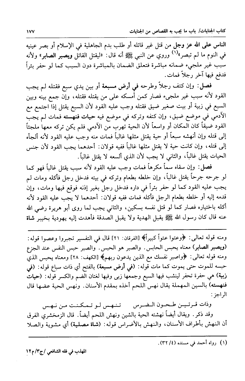 فصل: وإن كتف رجلا وطرحه في أرض مسبعة أو بين يدي سبع فقتله لم يجب القود لأنه سبب غير ملجئ فصار كمن أمسكه على من يقتله فقتله وإن جمع بينه وبين السبع في زريبة أو بيت صغير ضيق فقتله وجب عليه القود لأن السبع يقتل إذا اجتمع مع الآدمي في موضع ضيق وإن كتفه وتركه في موضع فيه حيات فنهسته فمات لم يجب القود ضيقاً كان المكان أو واسعاً لأن الحية تهرب من الآدمي فلم يكن تركه معها ملجئاً إلى قتله وإن أنهشه سبعاً أو حية يقتل مثلها غالباً فمات وجب عليه القود لأنه ألجأه إلى قتله وإن كانت حية لا يقتل مثلها غالباً ففيه قولان: أحدهما: يجب القود لأن خنس الحيات يقتل غالباً والثاني: لا يجب لأن الذي ألسعه لا يقتل غالباً.