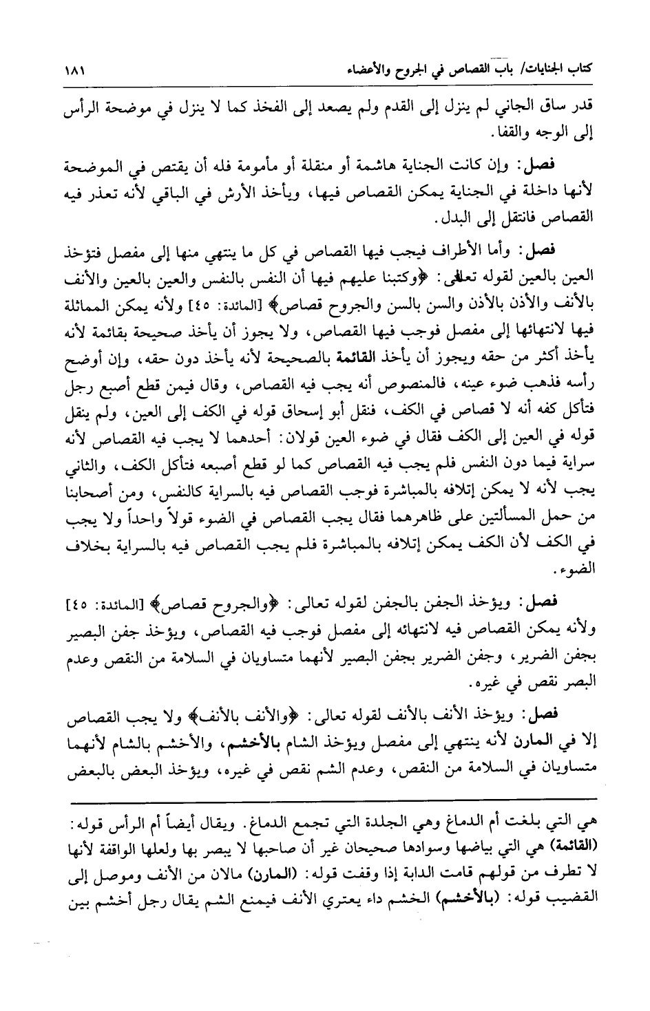 فصل: وأما الأطراف فيجب فيها القصاص في كل ما ينتهي منها إلى مفصل فتؤخذ العين بالعين لقوله تعالى: {وَكَتَبْنَا عَلَيْهِمْ فِيهَا أَنَّ النَّفْسَ بِالنَّفْسِ وَالْعَيْنَ بِالْعَيْنِ وَالْأَنْفَ بِالْأَنْفِ وَالْأُذُنَ بِالْأُذُنِ وَالسِّنَّ بِالسِّنِّ وَالْجُرُوحَ قِصَاصٌ} [المائدة: 45] ولأنه يمكن المماثلة فيها لانتهائها إلى مفصل فوجب فيها القصاص ولا يجوز أن يأخذ صحيحة بقائمة لأنه يأخذ أكثر من حقه ويجوز أن يأخذ القائمة بالصحيحة لأنه يأخذ دون حقه وإن أوضح رأسه فذهب ضوء عينه فالمنصوص أنه يجب فيه القصاص وقال فيمن قطع إصبع رجل فتأكل كفه أنه لا قصاص في الكف فنقل أبو إسحاق قوله في الكف إلى العين ولم ينقل قوله في العين إلى الكف فقال في ضوء العين قولان: أحدهما: لا يجب فيه القصاص لأنه سراية فيما دون النفس فلم يجب فيه القصاص كما لو قطع إصبعه فتأكل الكف والثاني: يجب لأنه لا يمكن إتلافه إلا بالمباشرة فوجب القصاص فيه بالسراية كالنفس ومن أصحابنا من حمل المسألتين على ظاهرهما فقال يجب القصاص في الضوء قولاً واحداً ولا يجب في الكف لأن الكف يمكن إتلافه بالمباشرة فلم يجب القصاص فيه بالسراية بخلاف الضوء.
