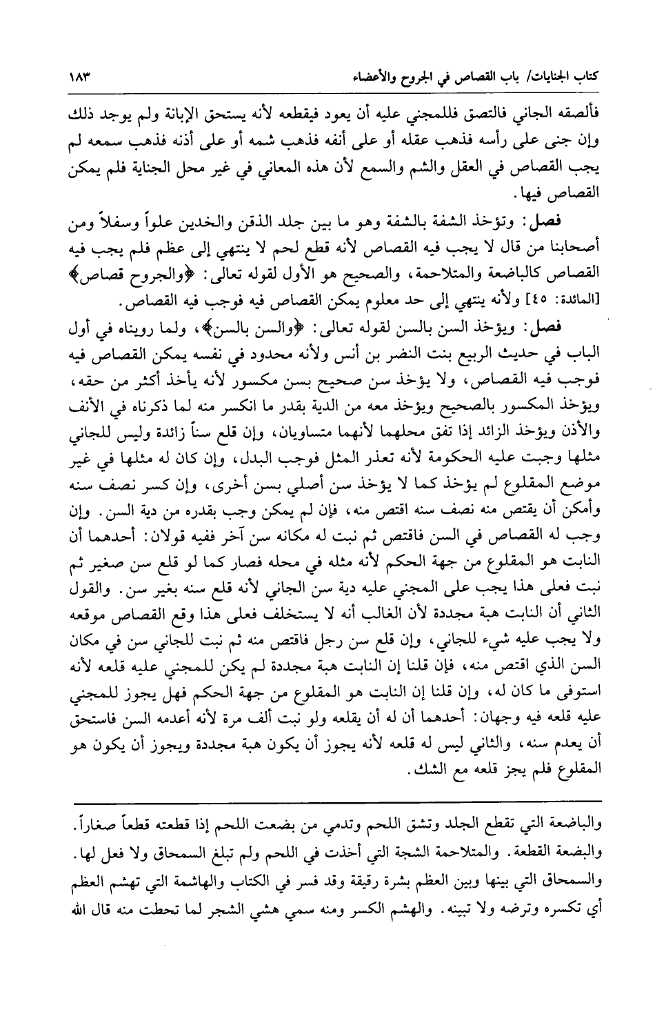 فصل: وتؤخذ الشفة بالشفة وهو ما بين جلد الذقن والخدين علواً وسفلاً ومن أصحابنا من قال لا يجب فيه القصاص لأنه قطع لحم لا ينتهي إلى عظم فلم يجب فيه القصاص كالباضعة والمتلاحمة والصحيح هو الأول لقوله تعالى: {وَالْجُرُوحَ قِصَاصٌ} [المائدة: 45] ولأنه ينتهي إلى حد معلوم يمكن القصاص فيه فوجب فيه القصاص.