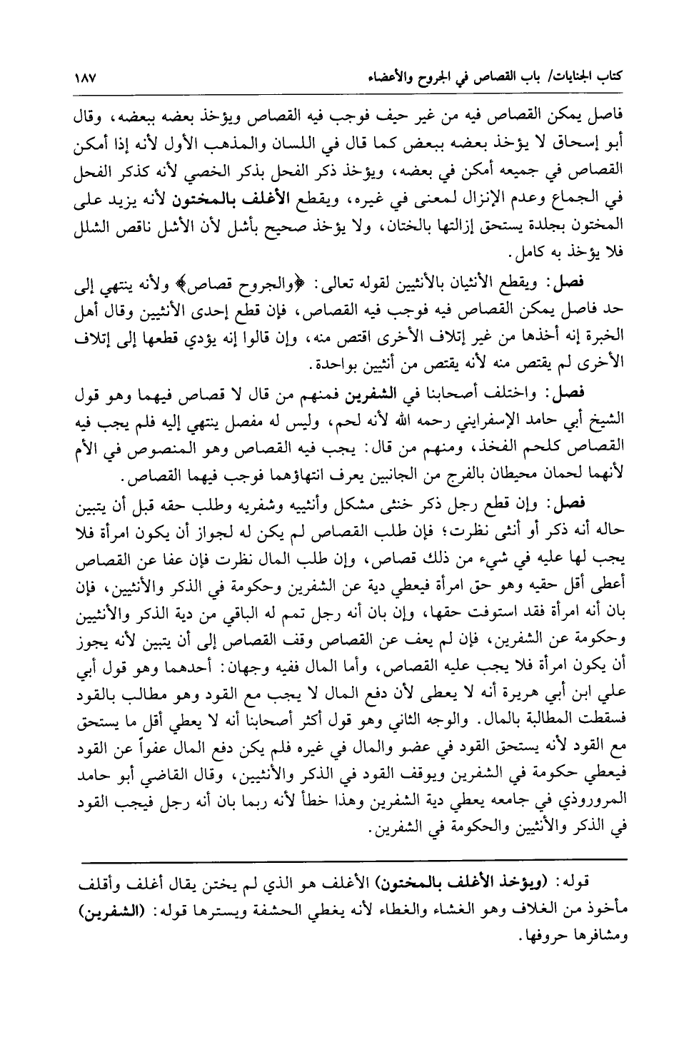 فصل: واختلف أصحابنا في الشفريين فمنهم من قال لا قصاص فيهما وهو قول الشيخ أبي حامد الإسفرايني رحمه الله لأنه لحم وليس له مفصل ينتهي إليه فلم يجب فيه القصاص كلحم الفخذ ومنهم من قال: يجب فيه القصاص وهو المنصوص في الأم لأنهما لحمان محيطان بالفرج من الجانبين يعرف انتهاؤهما فوجب فيهما القصاص.