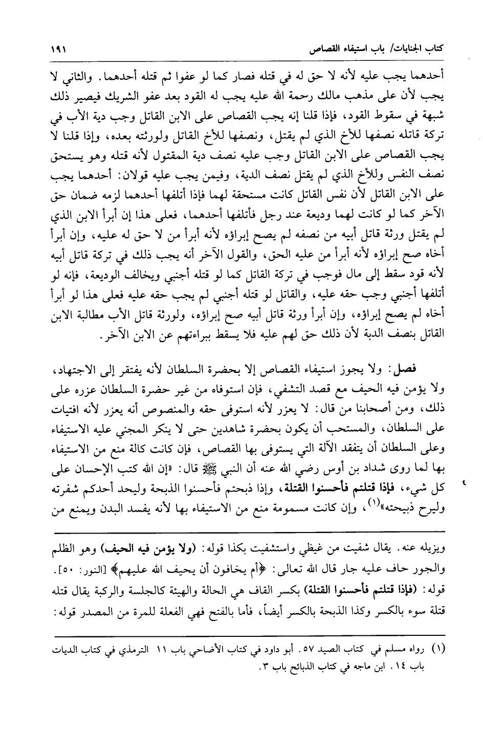 فصل: ولا يجوز استيفاء القصاص إلا بحضرة السلطان لأنه يفتقر إلى الاجتهاد ولا يؤمن فيه الحيف مع قصد التشفي فإن استوفاه من غير حضرة السلطان عزره على ذلك ومن أصحابنا من قال: لا يعزر لأنه استوفى حقه والمنصوص أنه يعزر لأنه افتيات على السلطان والمستحب أن يكون بحضرة شاهدين حتى لا ينكر المجني عليه الاستيفاء وعلى السلطان أن يتفقد الآلة التي يستوفى بها القصاص فإن كانت كالة منع من الاستيفاء بها لما روى شداد بن أوس رضي الله عنه أن النبي صلى الله عليه وسلم قال: "إن الله كتب الإحسان على كل شيء فإذا قتلتم فأحسنوا القتلة وإذا ذبحتم فأحسنوا الذبحة وليحد أحدكم شفرته وليرح ذبيحته" 1. وإن كانت مسمومة منع من الاستيفاء بها لأنه يفسد البدن ويمنع من