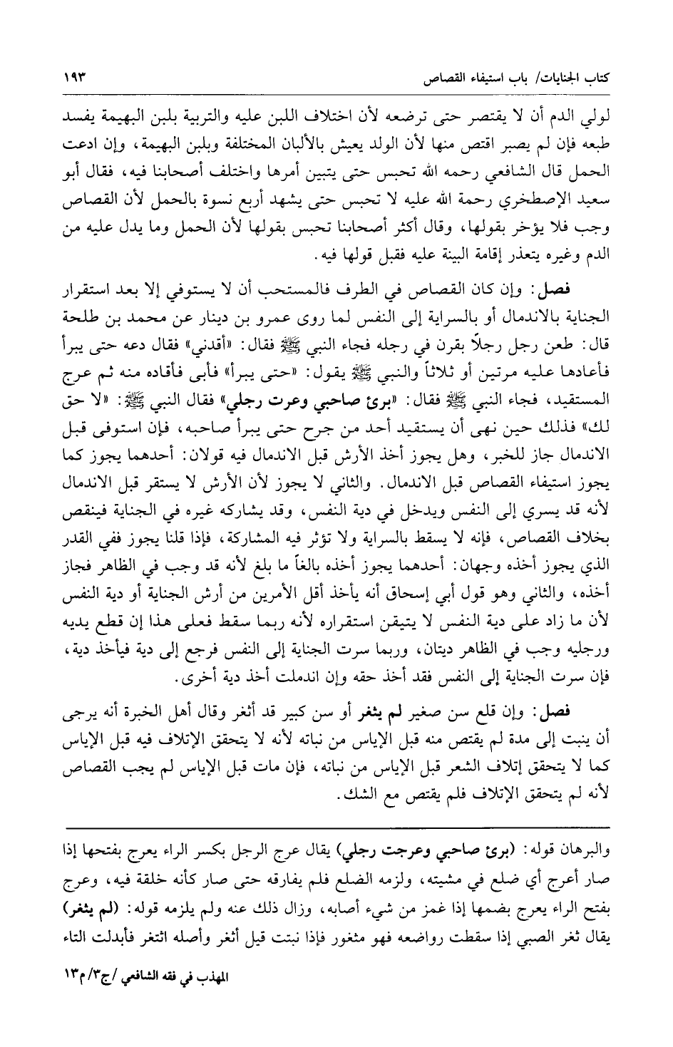 فصل: وإن كان القصاص في الطرف فالمستحب أن لا يستوفي إلا بعد استقرار الجناية بالاندمال أو بالسراية إلى النفس لما روى عمرو بن دينار عن محمد بن طلحة قال: طعن رجل رجلاً بقرن في رجله فجاء النبي صلى الله عليه وسلم فقال: أقدني فقال: "دعه حتى يبرأ" فأعادها عليه مرتين أو ثلاثاً والنبي صلى الله عليه وسلم يقول: "حتى يبرأ". فأبى فأقاده منه ثم عرج المستقيد فجاء النبي صلى الله عليه وسلم فقال: برئ صاحبي وعرت رجلي فقال النبي صلى الله عليه وسلم: "لا حق لك". فذلك حين نهى أن يستقيد أحد من جرح حتى يبرأ صاحبه فإن استوفى قبل الاندمال جاز للخبر وهل يجوز أخذ الأرش قبل الاندمال فيه قولان: أحدهما: يجوز كما يجوز استيفاء القصاص قبل الاندمال والثاني: لا يجوز لأن الأرش لا يستقر قبل الاندمال لأنه قد يسري إلى النفس ويدخل في دية النفس وقد يشاركه غيره في الجناية فينقص بخلاف القصاص فإنه لا يسقط بالسراية ولا تؤثر فيه المشاركة فإذا قلنا يجوز ففي القدر الذي يجوز أخذه وجهان: أحدهما: يجوز أخذه بالغاً ما بلغ لأنه قد وجب في الظاهر فجاز أخذه والثاني: وهو قول أبي إسحاق أنه يأخذ أقل الأمرين من أرش الجناية أودية النفس لأن ما زاد على دية النفس لا يتيقن استقراره لأنه ربما سقط فعلى هذا إن قطع يديه ورجليه وجب في الظاهر ديتان وربما سرت الجناية إلى النفس فرجع إلى دية فيأخذ دية فإن سرت الجناية إلى النفس فقد أخذ حقه وإن اندملت أخذ دية أخرى.