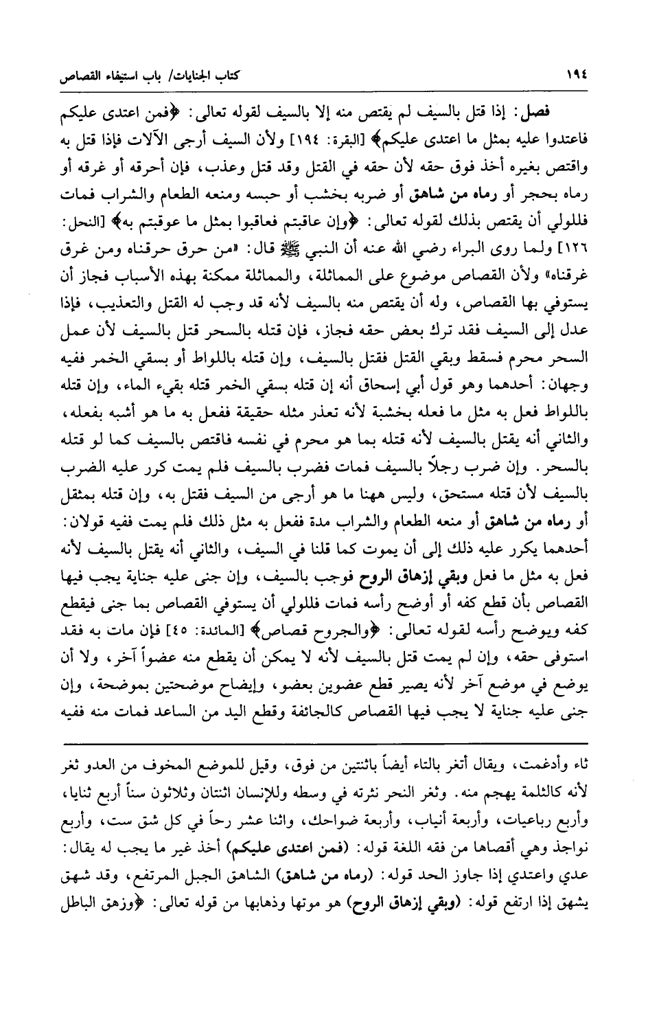 فصل: إذا قتل بالسيف لم يقتص منه إلا بالسيف لقوله تعالى: {فَمَنِ اعْتَدَى عَلَيْكُمْ فَاعْتَدُوا عَلَيْهِ بِمِثْلِ مَا اعْتَدَى عَلَيْكُمْ} [البقرة: 194] ولأن السيف أرجى الآلات فإذا قتل به واقتص بغيره أخذ فوق حقه لأن حقه في القتل وقد قتل وعذب فإن أحرقه أو أغرقه أورماه بحجر أورماه من شاهق أو ضربه بخشب أو حبسه ومنعه من الطعام والشراب فمات فللولي أن يقتص بذلك لقوله تعالى: {وَإِنْ عَاقَبْتُمْ فَعَاقِبُوا بِمِثْلِ مَا عُوقِبْتُمْ بِهِ} [النحل: 126] ولما روى البراءة رضي الله عنه أن النبي صلى الله عليه وسلم قال: "من حرق حرقناه ومن غرق غرقناه". ولأن القصاص موضوع على الماثلة والمماثلة ممكنة بهذه الأسباب فجاز أن يستوفي بها القصاص وله أن يقتص منه بالسيف لأنه قد وجب له القتل والتعذيب فإذا عدل إلى السيف فقد ترك بعض حقه فجاز فإن قتله بالسحر قتل بالسيف لأن عمل السحر محرم فسقط وبقي القتل فقتل بالسيف وإن قتله باللواط أو بسقي الخمر ففيه وجهان: أحدهما: وهو قول أبي إسحاق أنه إن قتله بسقي الخمر قتله بقيء الماء وإن قتله باللواط فعل به مثل ما فعله بخشبه لأنه تعذر مثله حقيقة ففعل به ما هو أشبه بفعله والثاني: أنه يقتله بالسيف لأنه قتله بما هو محرم في نفسه فاقتص بالسيف كما لو قتله بالسحر وإن ضرب رجلاً بالسيف فمات فضرب بالسيف فلم يمت كرر عليه الضرب بالسيف لأن قتله مستحق وليس هاهنا ما هو أرجى من السيف فقتل به وإن قتله بمثقل أورماه من شاهق أو منعه من الطعام والشراب مدة ففعل به مثل ذلك فلم يمت ففيه قولان: أحدهما: يكرر عليه ذلك إلى أن يموت كما قلنا في السيف والثاني: أنه يقتل بالسيف لأنه فعل به مثل ما فعل وبقي إزهاق الروح فوجب بالسيف وإن جنى عليه جناية يجب فيها القصاص بأن قطع كفه أو أوضح رأسه فمات فللولي أن يستوفي القصاص بما جنى فيقطع كفه ويوضح رأسه لقوله تعالى: {وَالْجُرُوحَ قِصَاصٌ} [المائدة45] فإن مات به فقد استوفى حقه وإن لم يمت قتل بالسيف لأنه لا يمكن أن يقطع منه عضواً آخر ولا أن يوضع في موضع آخر لأنه يصير قطع عضوين بعضو وإيضاح موضحتين بموضحة وإن جنى عليه جناية لا يجب فيها القصاص كالجائفة وقطع اليد من الساعد فمات منه ففيه