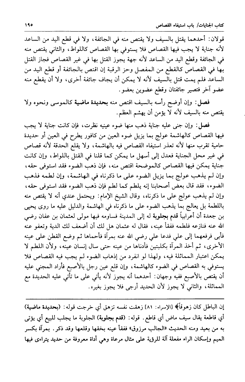 فصل: وإن جنى عليه جناية ذهب منها ضوء عينيه نظرت فإن كانت جناية لا يجب فيها القصاص كالهاشمة عولج بما يزيل ضوء العين من كافور يطرح في العين أو حديدة حامية تقرب منها لأنه تعذر استيفاء القصاص فيه بالهاشمة ولا يقلع الحدقة لأنه قصاص في غير محل الجناية فعدل إلى أسهل ما يمكن كما قلنا في القتل باللواط وإن كانت جناية يمكن فيها القصاص كالموضحة اقتص منه فإن ذهب الضوء فقد استوفى حقه وإن لم يذهب عولج بما يزيل الضوء على ما ذكرناه في الهاشمة وإن لطمه فذهب الضوء فقد قال بعض أصحابنا إنه يلطم كما لطم فإن ذهب الضوء فقد استوفى حقه وإن لم يذهب عولج على ما ذكرناه وقال الشيخ الإمام: ويحتمل عندي أنه لا يقتص منه باللطمة بل يعالج بما يذهب الضوء على ما ذكرناه في الهاشمة والدليل عليه ما روى يحيى بن جعده أن أعرابياً قدم بجلوبة له إلى المدينة فساومه فيها مولى لعثمان بن عفان رضي الله عنه فنازعه فلطمه ففقأ عينه فقال له عثمان هل لك أن أضعف لك الدية وتعفو عنه فأبى فرفعهما إلى علي فدعا علي رضي الله عنه بمرآة فأحماها ثم وضع القطن على عينه الأخرى ثم أخذ المرآة بكلبتين فأدناها من عينه حتى سال إنسان عينه ولأن اللطم لا يمكن اعتبار المماثلة فيه ولهذا فهو انفراد من إذهاب الضوء لم يجب فيه القصاص فلا يستوفي به القصاص في الضوء كالهاشمة وإن قلع عين رجل بالأصبع فأراد المجني عليه أن يقتص بالإصبع ففيه وجهان: أحدهما: يجوز لأنه يأتي على ما تأتي عليه الحديدة مع المماثلة والثاني: لا يجوز لأن الحديد أرجى فلا يجوز بغيره.