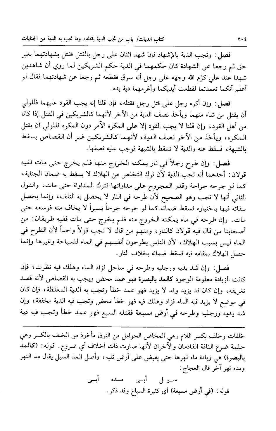 فصل: وإن شد يده ورجليه وطرحه في الساحل فزاد الماء وهلك فيه نظرت فإن كانت الزيادة معلومة الوجود كالمد بالبصرة فهو عمد محض ويجب به القصاص لأنه قصد تغريقه وإن كان قد يزيد وقد لا يزيد فهو عمد خطأ وتجب به الدية المغلظة فإن كان في موضع لا يزيد فيه الماء فزاد وهلك فيه فهو خطأ محض وتجب فيه الدية مخففة وإن شد يديه ورجليه وطرحه في أرض مسبعة فقتله السبع فهو عمد خطأ وتجب فيه دية
