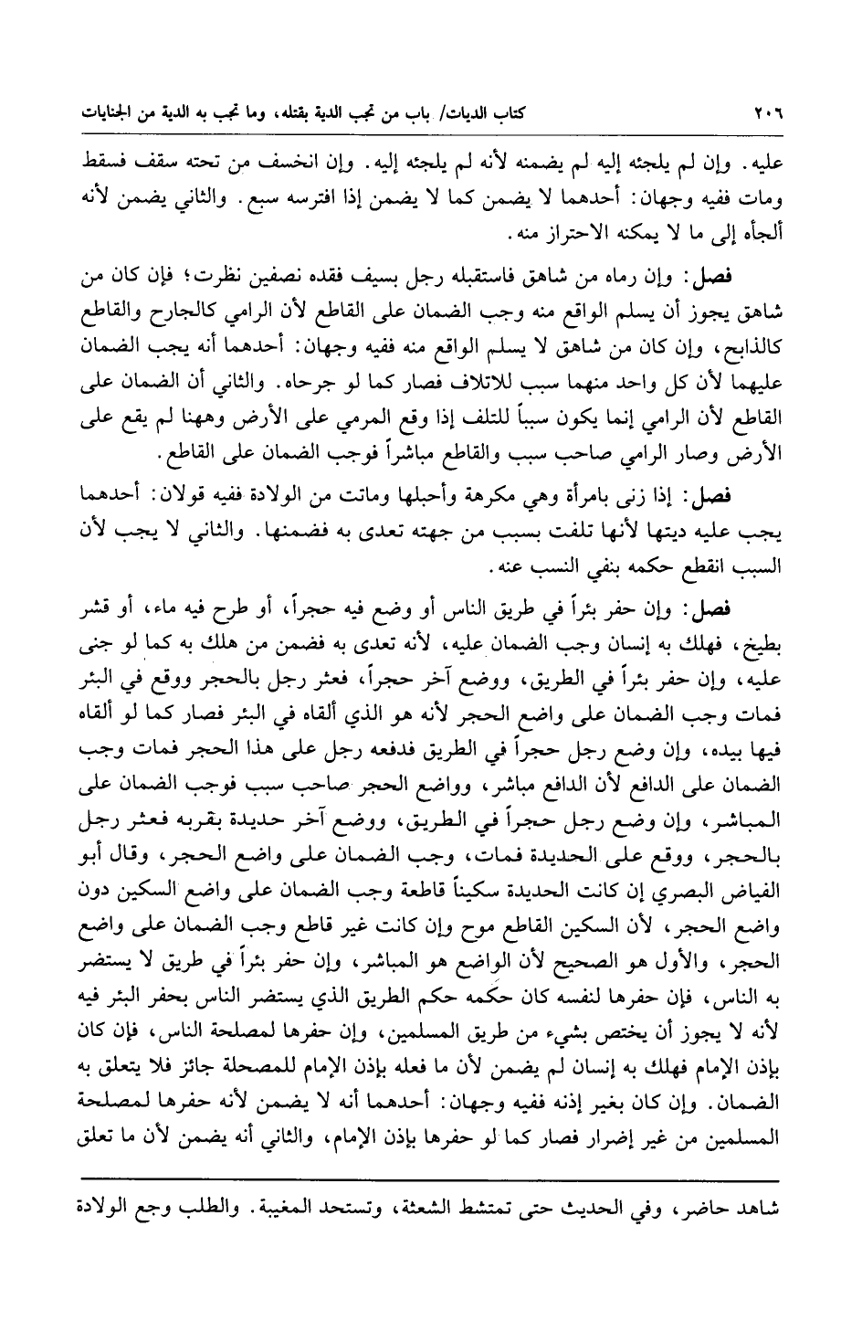 فصل: وإن حفر بئراً في طريق الناس أو وضع فيه حجراً أو طرح فيه ماء أو قشر بطيخ فهلك به إنسان وجب الضمان عليه لأنه تعدى به فضمن من هلك به كما لو جنى عليه وإن حفر بئراً في الطريق ووضع آخر حجراً فعثر رجل بالحجر ووقع في البئر فمات وجب الضمان على واضع الحجر لأنه هو الذي ألقاه في البئر فصار كما لو ألقاه فيها بيده وإن وضع رجل حجراً في الطريق فدفعه رجل على هذا الحجر فمات وجب الضمان على الدافع لأن الدافع مباشر وواضع الحجر صاحب سبب فوجب الضمان على المباشر وإن وضع رجل حجراً في الطريق ووضع آخر حديدة بقربه فعثر رجل بالحجر ووقع على الحديدة فمات وجب الضمان على واضع الحجر وقال أبو الفياض البصري إن كانت الحديدة سكيناً قاطعة وجب الضمان على واضع السكين دون واضع الحجر والأول هو الصحيح لأن الواضع هو المباشر وإن حفر بئراً في طريق لا يستضر به الناس فإن حفرها لنفسه كان حكمه حكم الطريق الذي يستضر الناس بحفر البئر فيه لأنه لا يجوز أن يختص بشيء من طريق المسلمين وإن حفرها لمصلحة الناس فإن كان بإذن الإمام فهلك به إنسان لم يضمن لأن ما فعله بإذن الإمام للمصلحة جائز فلا يتعلق به الضمان وإن كان بغير إذنه ففيه وجهان: أحدهما: أنه لا يضمن لأنه حفرها لمصلحة المسلمين من غير إضرار فصار كما لو حفرها بإذن الإمام والثاني: أنه يضمن لأن ما تعلق