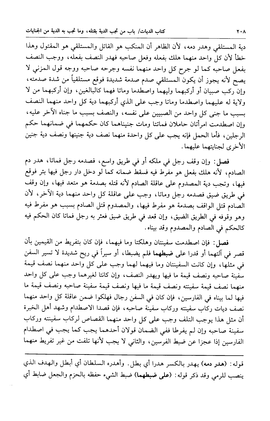 فصل: فإن اصطدمت سفينتان وهلكتا وما فيهما فإن كان بتفريط من القيمين بأن قصر في آلتهما أو قدرا على ضبطهما فلم يضبطا أو سيراً في ريح شديدة لا تسير السفن في مثلها وإن كانت السفينتان وما فيهما لهما وجب على كل واحد منهما نصف قيمة سفينة صاحبه ونصف قيمة ما فيها ويهدر النصف وإن كانتا لغيرهما وجب على كل واحد منهما نصف قيمة سفينته ونصف قيمة ما فيها ونصف قيمة سفينة صاحبه ونصف قيمة ما فيها لما بيناه في الفارسين فإن كان في السفن رجال فهلكوا ضمن عاقلة كل واحد منهما نصف ديات ركاب سفينته وركاب سفينة صاحبه فإن قصدا الاصطدام وشهد أهل الخبرة أن مثل هذا يوجب التلف وجب على كل واحد منهما القصاص لركاب سفينته وركاب سفينة صاحبه وإن لم يفرطا ففي الضمان قولان أحدهما: يجب كما يجب في اصطدام الفارسين إذا عجزا عن ضبط الفرسين والثاني: لا يجب لأنها تلفت من غير تفريط منهما