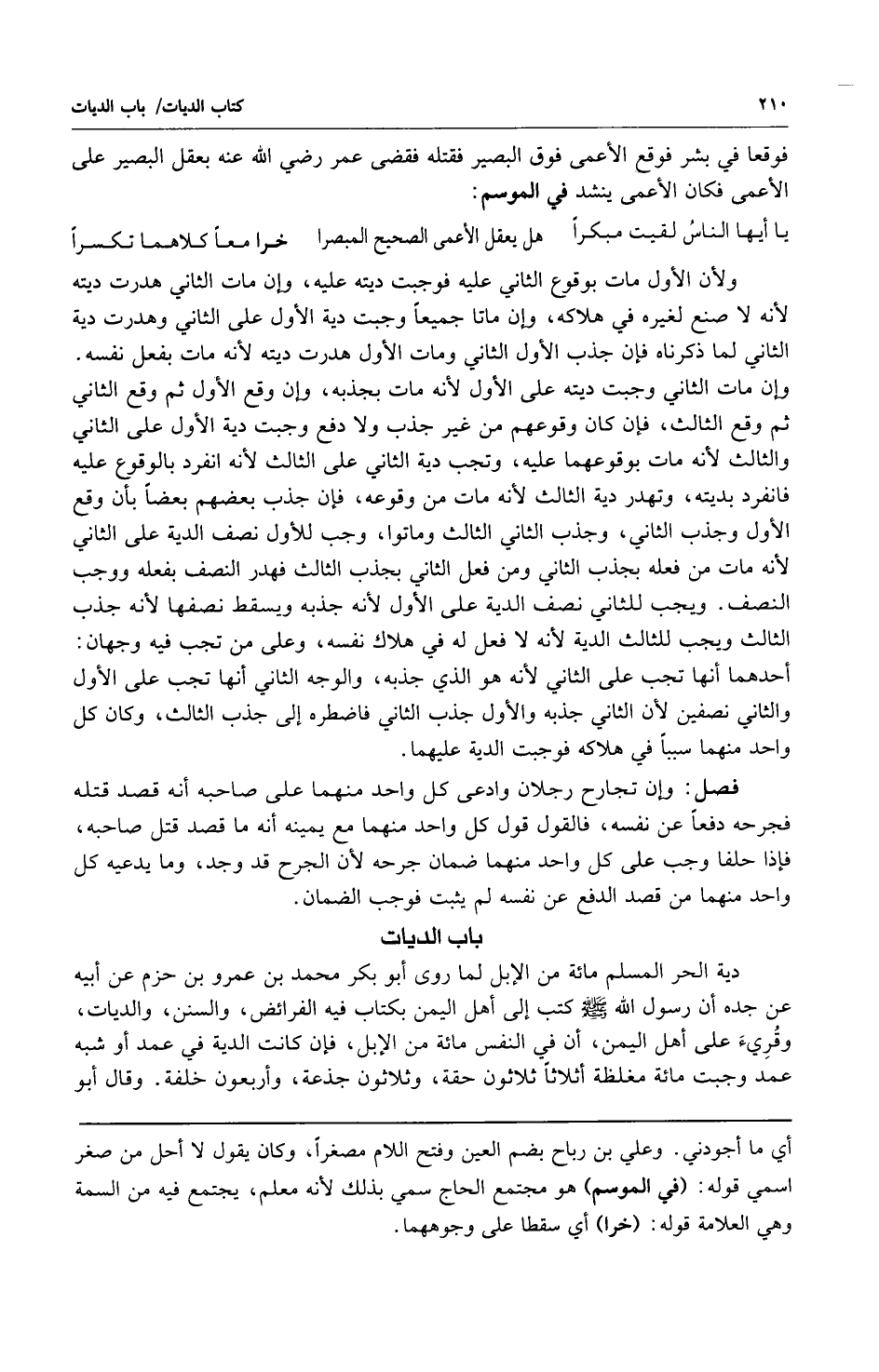 فوقعا في بشر فوقع الأعمى فوق البصير فقتله فقضى عمر رضي الله عنه بعقل البصير على الأعمى فكان الأعمى ينشد في الموسم: