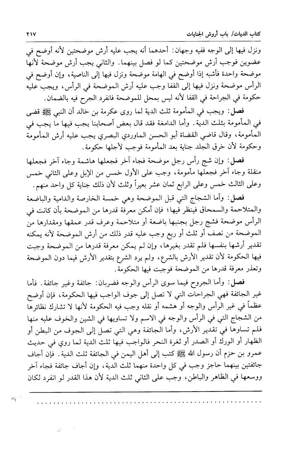 فصل: وأما الشجاج التي قبل الموضحة وهي خمسة الخارصة والدامية والباضعة والمتلاحقة والسمحاق فينظر فيها فإن أمكن معرفة قدرها من الموضحة بأن كانت في الرأس موضحة فشج رجل بجنبها باضعة أو متلاحمة وعرف قدر عمقها ومقدارها من الموضحة من نصف أو ثلث أو ربع وجب عليه قدر ذلك من أرش الموضحة لأنه يمكنه تقدير أرشها بنفسها فلم تقدر بغيرها وإن لم يمكن معرفة قدرها من الموضحة وجبت فيها الحكومة لأن تقدير الأرش بالشرع ولم يرد الشرع بتقدير الأرش فيما دون الموضحة وتعذر معرفة قدرها من الموضحة فوجبت فيها الحكومة.