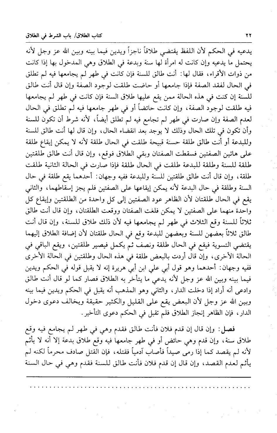 يدعيه في الحكم لأن اللفظ يقتضي طلاقاً ناجزا ويدين فيما بينه وبين الله عز وجل لأنه يحتمل ما يدعيه وإن كانت له امرأة لها سنة وبدعة في الطلاق وهي المدخول بها إذا كانت من ذوات الأقراء فقال لها: أنت طالق للسنة فإن كانت في طهر لم يجامعها فيه لم تطلق في الحال لفقد الصفة فإذا جامعها أو حاضت طلقت لوجود الصفة وإن قال أنت طالق للسنة إن كنت في هذه الحالة ممن يقع عليها طلاق السنة فإن كانت في طهر لم يجامعها فيه طلقت لوجود الصفة وإن كانت حائضا أوفي طهر جامعها فيه لم تطلق في الحال لعدم الصفة وإن صارت في طهر لم تجامع فيه لم تطلق أيضاً لأنه شرط أن تكون للسنة وأن تكون في تلك الحال وذلك لا يوجد بعد انقضاء الحال وإن قال لها أنت طالق للسنة وللبدعة أو أنت طالق طلقة حسنة قبيحة طلقت في الحال طلقة لأنه لا يمكن إيقاع طلقة على هاتين الصفتين فسقطت الصفتان وبقي الطلاق فوقع وإن قال أنت طالق طلقتين طلقة للسنة وطلقة للبدعة طلقت في الحال طلقة فإذا صارت في الحالة الثانية طلقت طلقة وإن قال أنت طالق طلقتين للسنة وللبدعة ففيه وجهان: أحدهما: يقع طلقة في حال السنة وطلقة في حال البدعة لأنه يمكن إيقاعها على الصفتين فلم يجز إسقاطهما والثاني: يقع في الحال طلقتان لأن الظاهر عود الصفتين إلى كل واحدة من الطلقتين وإيقاع كل واحدة منهما على الصفتين لا يمكن فلغت الصفتان ووقعت الطلقتان وإن قال أنت طالق ثلاثاً للسنة وقع الثلاث في طهر لم يجامعها فيه لأن ذلك طلاق للسنة وإن قال أنت طالق ثلاثا بعضهن للسنة وبعضهن للبدعة وقع في الحال طلقتان لأن إضافة الطلاق إليهما يقتضي التسوية فيقع في الحال طلقة ونصف ثم يكمل فيصير طلقتين ويقع الباقي في الحالة الأخرى وإن قال أردت بالبعض طلقة في هذه الحال وطلقتين في الحالة الأخرى ففيه وجهان: أحدهما: وهو قول أبي علي ابن أبي هريرة إنه لا يقبل قوله في الحكم ويدين فيما بينه وبين الله عز وجل لأنه يدعي ما يتأخر به الطلاق فصار كما لو قال أنت طالق وادعى أنه أراد إذا دخلت الدار والثاني: وهو المذهب أنه يقبل في الحكم ويدين فيما بينه وبين الله عز وجل لأن البعض يقع على القليل والكثير حقيقة ويخالف دعوى دخول الدار فإن الظاهر إنجاز الطلاق فلم تقبل في الحكم دعوى التأخير.