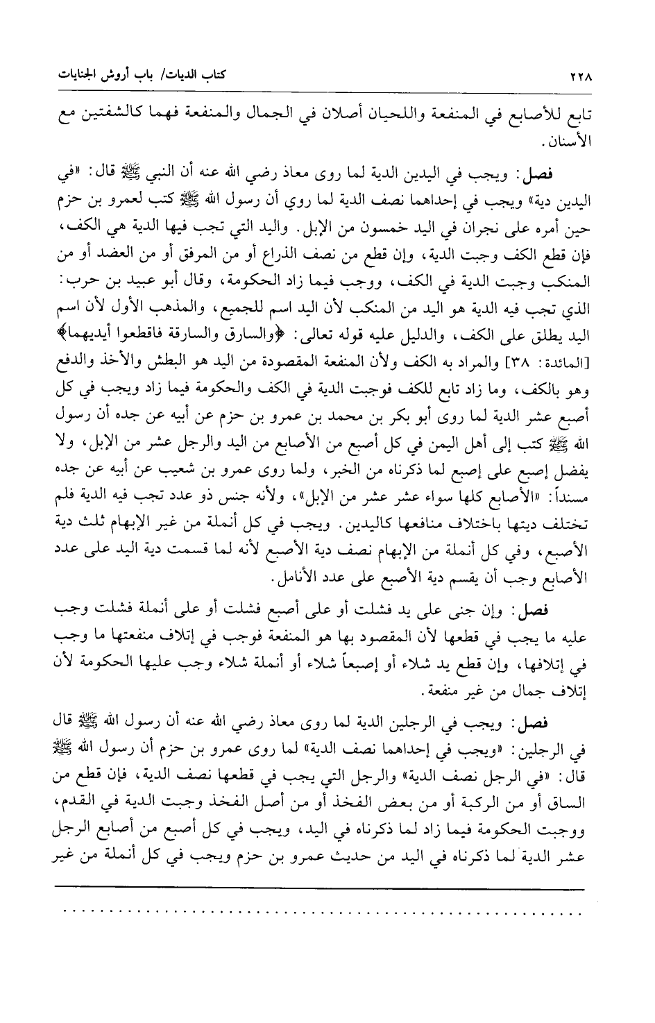 فصل: ويجب في اليدين الدية لما روى معاذ رضي الله عنه أن النبي صلى الله عليه وسلم قال: "في اليدين دية". ويجب في إحداهما نصف الدية لما روي أن رسول الله صلى الله عليه وسلم كتب عمرو بن حزم حين أمره على نجران في اليد خمسون من الإبل واليد التي تجب فيها الدية هي الكف فإن قطع الكف وجبت الدية وإن قطع من نصف الذراع أومن المرفق أومن العضد أومن المنكب وجبت الدية في الكف ووجب فيما زاد الحكومة وقال أبو عبيد بن حرب: الذي تجب فيه الدية هو اليد من المنكب لأن اليد اسم للجميع والمذهب الأول لأن اسم اليد يطلق على الكف والدليل عليه قوله تعالى: {وَالسَّارِقُ وَالسَّارِقَةُ فَاقْطَعُوا أَيْدِيَهُمَا} [المائدة: 38] والمراد به الكف ولأن المنفعة المقصودة من اليد هو البطش والأخذ والدفع وهو بالكف وما زاد تابع للكف فوجبت الدية في الكف والحكومة فيما زاد ويجب في كل أصبع عشر الدية لما روى أبو بكر بن محمد بن عمرو بن حزم عن أبيه عن جده أن رسول الله صلى الله عليه وسلم كتب إلى أهل اليمن في كل أصبع من الأصابع من اليد والرجل عشر من الإبل ولا يفضل إصبع على إصبع لما ذكرناه من الخبر ولما روى عمرو بن شعيب عن أبيه عن جده مسنداً: "الأصابع كلها سواء عشر عشر من الإبل". ولأنه جنس ذو عدد تجب فيه الدية فلم تختلف ديتها باختلاف منافعها كاليدين ويجب في كل أنملة من غير الإبهام ثلث دية الأصبع وفي كل أنملة من الإبهام نصف دية الأصبع لأنه لما قسمت دية اليد على عدد الأصابع وجب أن يقسم دية الأصبع على عدد الأنامل.