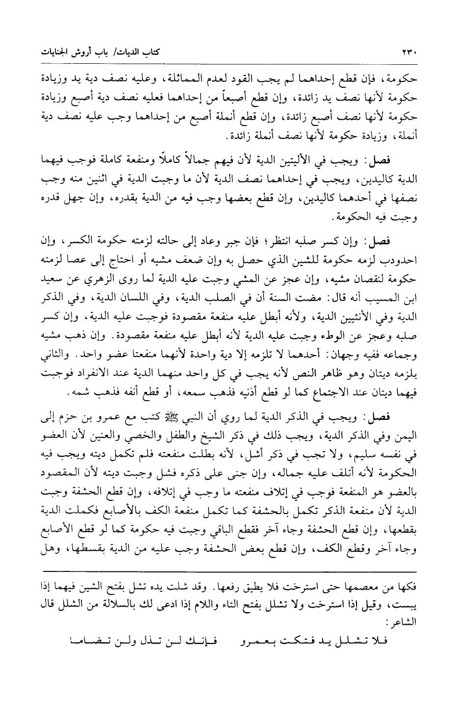 فصل: ويجب في الذكر الدية لما روي أن النبي صلى الله عليه وسلم كتب مع عمرو بن حزم إلى اليمن وفي الذكر الدية ويجب ذلك في ذكر الشيخ والطفل والخصي والعنين لأن العضو في نفسه سليم ولا تجب في ذكر أشل لأنه بطلب منفعته فلم تكمل ديته ويجب فيه الحكومة لأنه أتلف عليه جماله وإن جنى على ذكره فشل وجبت ديته لأن المقصود بالعضو هو المنفعة فوجب في إتلاف منفعته ما وجب في إتلافه وإن قطع الحشفة وجبت الدية لأن منفعة الذكر تكمل بالحشفة كما تكمل منفعة الكف بالأصابع فكملت الدية بقطعها وإن قطع الحشفة وجاء آخر فقطع الباقي وجبت فيه حكومة كما لو قطع الأصابع وجاء آخر وقطع الكف وإن قطع بعض الحشفة وجب عليه من الدية بقسطها وهل