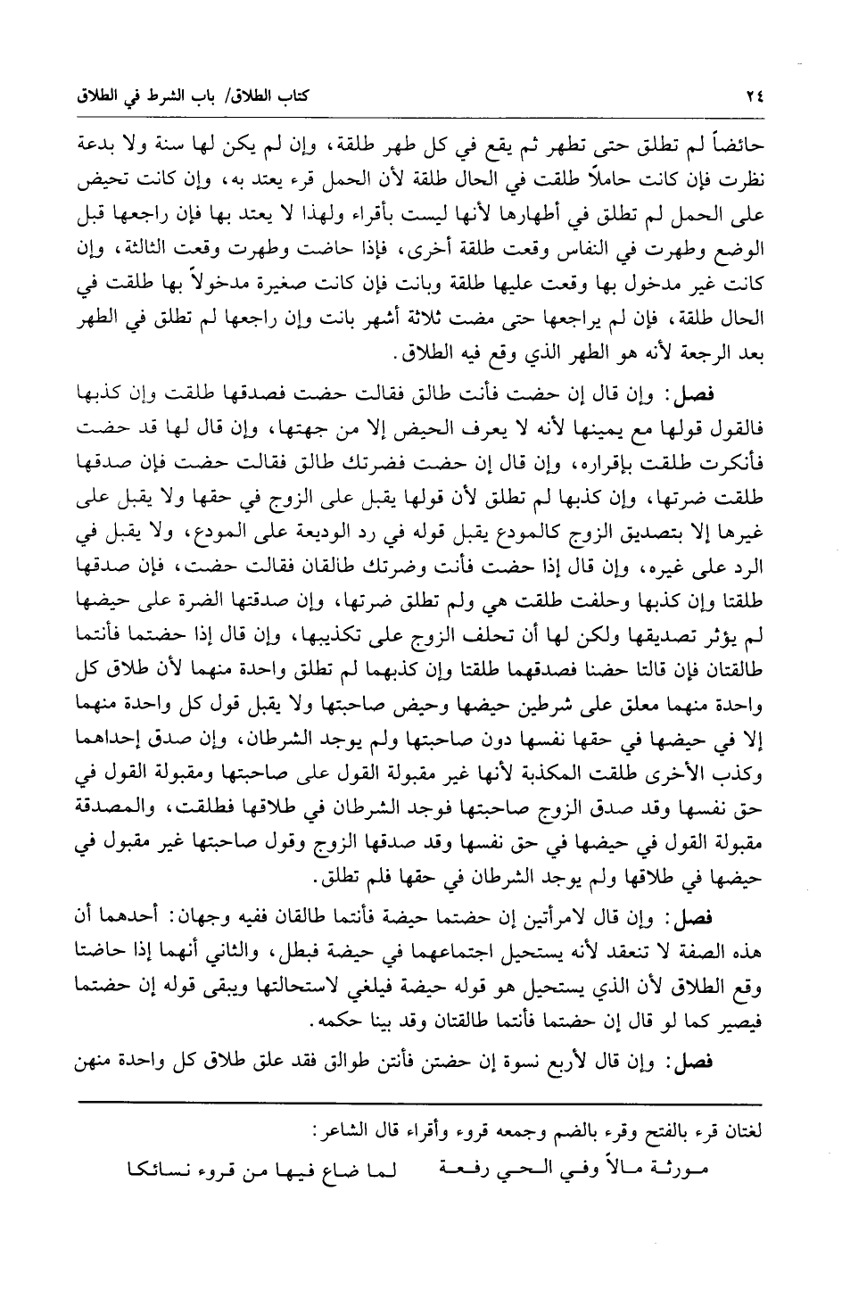 فصل: وإن قال إن حضت فأنت طالق فقالت حضت فصدقها طلقت وإن كذبها فالقول قولها مع يمينها لأنه لا يعرف الحيض إلا من جهتها وإن قال لها قد حضت فأنكرت طلقت بإقراره وإن قال لها إن حضت فضرتك طالق فقالت حضت فإن صدقها طلقت ضرتها وإن كذبها لم تطلق لأن قولها يقبل على الزوج في حقها ولا يقبل على غيرها إلا بتصديق الزوج كالمودع يقبل قوله في رد الوديعة على المودع ولا يقبل في الرد على غيره وإن قال إذا حضت فأنت وضرتك طالقان فقالت حضت فإن صدقها طلقتا وإن كذبها وحلفت طلقت هي ولم تطلق ضرتها وإن صدقتها الضرة على حيضها لم يؤثر تصديقها ولكن لها أن تحلف الزوج على تكذيبها وإن قال إذا حضتما فأنتما طالقتان فإن قالتا حضنا فصدقهما طلقتا وإن كذبهما لم تطلق واحدة منهما لأن طلاق كل واحدة منهما معلق على شرطين حيضها وحيض صاحبتها ولا يقبل قول كل واحدة منهما إلا في حيضها أوفي حقها نفسها دون صاحبتها ولم يوجد الشرطان وإن صدق إحداهما وكذب الأخرى طلقت المكذبة لأنها غير مقبولة القول على صاحبتها ومقبولة القول في حق نفسها وقد صدق الزوج صاحبتها فوجد الشرطان في طلاقها فطلقت والمصدقة مقبولة القول في الحيض في حق نفسها وقد صدقها الزوج وقول صاحبتها غير مقبول في حيضها في طلاقها ولم يوجد الشرطان في حقها فلم تطلق.