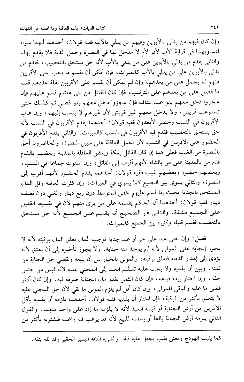 وإن كان فيهم من يدلي بالأبوين وفيهم من يدلي بالأب ففيه قولان: أحدهما: أنهما سواء لتساويهما في قرابة الأب لأن الأم لا مدخل لها في النصرة وحمل الدية فلا يقدم بها والثاني: يقدم من يدلي بالأبوين على من يدلي بالأب لأنه حق يستحق بالتعصيب فقدم من يدلي بالأبوين على من يدلي بالأب كالميراث فإن أمكن أن يقسم ما يجب على الأقربين منهم لم يحمل على من بعدهم وإن لم يمكن أن يقسم على الأقربين لقلة عددهم قسم ما فضل على من بعدهم على الترتيب فإن كان القاتل من بني هاشم قسم عليهم فإن عجزوا دخل معهم بنو عبد مناف فإن عجزوا دخل معهم بنو قصي ثم كذلك حتى تستوعب قريش ولا يدخل معهم غير قريش لأن غيرهم لا ينسب إليهم وإن غاب الأقربون في النسب وحضر الأبعدون ففيه قولان: أحدهما: يقدم الأقربون في النسب لأنه حق يستحق بالتعصيب فقدم فيه الأقربون في النسب كالميراث والثاني: يقدم الأقربون في الحضور على الأقربين في النسب لأن تحمل العاقلة على سبيل النصرة والحاضرون أحق بالنصرة من الغيب فعلى هذا إن كان القاتل بمكة وبعض العاقلة بالمدينة وبعضهم بالشام قدم من بالمدينة على من بالشام لأنهم أقرب إلى القاتل وإن استوت جماعة في النسب وبعضهم حضور وبعضهم غيب ففيه قولان: أحدهما: يقدم الحضور لأنهم أقرب إلى النصرة والثاني: يسوي بين الجميع كما يسوي في الميراث وإن كثرت العاقلة وقل المال المستحق بالجناية بحيث إذا قسم عليهم خص المتوسط دون ربع دينار والغني دون نصف دينار ففيه قولان: أحدهما: أن الحاكم يقسمه على من يرى منهم لأن في تقسيط القليل على الجميع مشقة والثاني: هو الصحيح أنه يقس على الجميع لأنه حق يستحق بالتعصيب فقسم قليله وكثيره بين الجميع كالميراث.