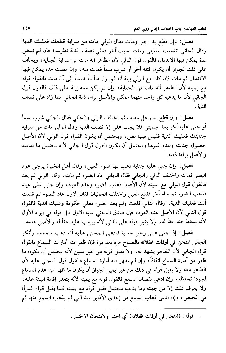 فصل: إذا جنى على رجل جناية فادعى المجني عليه أنه ذهب سمعه وأنكر الجاني امتحن في أوقات غفلاته بالصياح مرة بعد مرة فإن ظهر منه إمارات السماع فالقول قول الجاني لأن الظاهر يشهد له ولا يقبل قوله من غير يمين لأنه يحتمل أن يكون ما ظهر من أمارة السماع اتفاقاً وإن لم يظهر منه أمارة السماع فالقول قول المجني عليه لأن الظاهر معه ولا يقبل قوله في ذلك من غير يمين لجواز ما ظهر من عدم السماع لجودة تحفظه وإن ادعى نقصان السمع فالقول قوله مع يمينه لأنه يتعذر إقامة البينة عليه ولا يعرف ذلك إلا من جهته وما يدعيه محتمل فقبل قوله مع يمينه كما يقبل قول المرأة في الحيض وإن ادعى ذهاب السمع من إحدى الأذنين سد التي لم يذهب السمع منها ثم