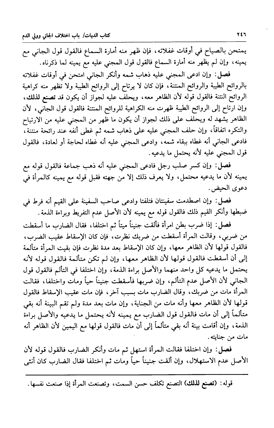فصل: إذا ضرب بطن امرأة فألقت جنيناً ميتاً ثم اختلفا فقال الضارب ما أسقطت من ضربي وقالت المرأة أسقطت من ضربك نظرت فإن كان الإسقاط عقيب الضربة فالقول قولها لأن الظاهر معها وإن كان الإسقاط بعد مدة نظرت فإن بقيت المرأة متألمة إلى أن أسقطت فالقول قولها لأن الظاهر معها وإن لم تكن متألمة فالقول قوله لأنه يحتمل ما يدعيه كل واحد منهما والأصل براءة الذمة وإن اختلفا في التألم فالقول قول الجاني لأن الأصل عدم التألم وإن ضربها فأسقطت جنيناً حياً ومات واختلفا فقالت المرأة مات من ضربك وقال الضارب مات بسبب آخر فإن مات عقب الإسقاط فالقول قولها لأن الظاهر معها وأنه مات من الجناية وإن مات بعد مدة ولم تقم البينة أنه بقي متألماً إلى أن مات فالقول قول الضارب مع يمينه لأنه يحتمل ما يدعيه والأصل براءة الذمة وإن أقامت بينة أنه بقي متألماً إلى أن مات فالقول قولها مع اليمين لأن الظاهر أنه مات من جنايته.