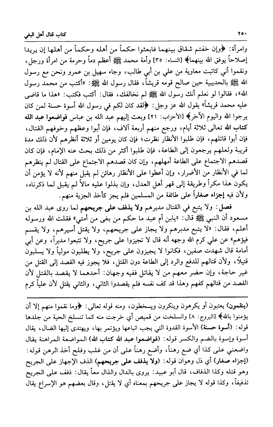وامرأة: {وَإِنْ خِفْتُمْ شِقَاقَ بَيْنِهِمَا فَابْعَثُوا حَكَماً مِنْ أَهْلِهِ وَحَكَماً مِنْ أَهْلِهَا إِنْ يُرِيدَا إِصْلاحاً يُوَفِّقِ الله بَيْنَهُمَا} [النساء: 35] وأمة محمد صلى الله عليه وسلم أعظم دما وحرمة من امرأة ورجل ونقموا أني كاتبت معاوية من علي بن أبي طالب وجاء سهيل بن عمرو ونحن مع رسول الله صلى الله عليه وسلم بالحديبية حين صالح قومه قريشاً فقال رسول الله صلى الله عليه وسلم: "أكتب من محمد رسول الله". فقالوا لو نعلم أنك رسول الله صلى الله عليه وسلم لم نخالفك فقال أكتب فكتب: "هذا ما قاضى محمد عليه قريشاً". يقوا الله عز وجل: {لَقَدْ كَانَ لَكُمْ فِي رَسُولِ الله أُسْوَةٌ حَسَنَةٌ لِمَنْ كَانَ يَرْجُو الله وَالْيَوْمَ الْآخِرَ} [الأحزاب: 21] وبعث إليهم عبد الله بن عباس فواضعوا عبد الله كتاب الله تعالى ثلاثة أيام ورجع منهم أربعة آلاف فإن أبوا وعظهم وخوفهم القتال فإن أبوا قاتلهم فإن طلبوا الأنظار نظرت فإن كان يومين أو ثلاثة أنظرهم لأن ذلك مدة قريبة ولعلهم يرجعون إلى الطاعة فإن طلبوا أكثر من ذلك بحث عنه الإمام فإن كان قصدهم الاجتماع على الطاعة أمهلهم وإن كان قصدهم الاجتماع على القتال لم ينظرهم لما في الأنظار من الأضرار وإن أعطوا على الأنظار رهائن لم يقبل منهم لأنه لا يؤمن أن يكون هذا مكراً وطريقة إلى قهر أهل العدل وإن بذلوا عليه مالاً لم يقبل لما ذكرناه ولأن فيه إجزاء صغاراً على طائفة من المسلمين فلم يجز كأخذ الجزية منهم.